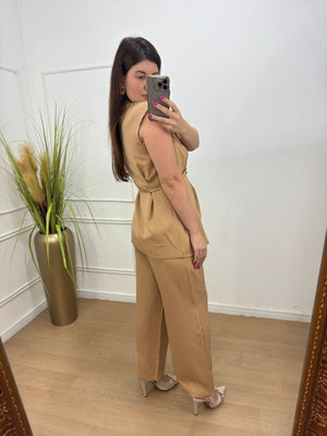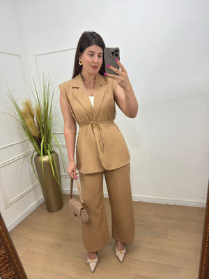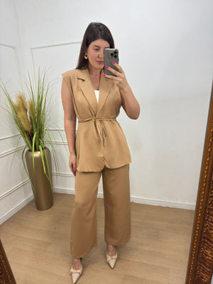Conjunto na alfaitaria colete com manga todo forrado estruturado possui ombreiras, botão frontal+ amarração.