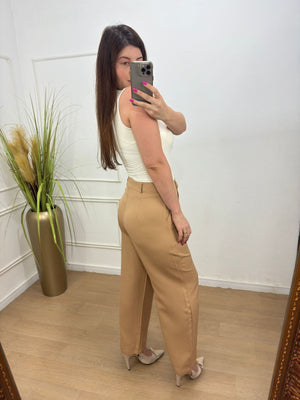 Calça modelagem larguinha, cos alto, zíper e bolso faça frontal, possui passa cinto.