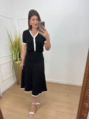 Conjunto em tricô modal com poliamida composto de blusa com botões+ saia midi evasê.