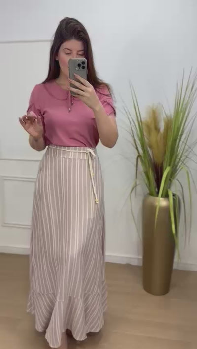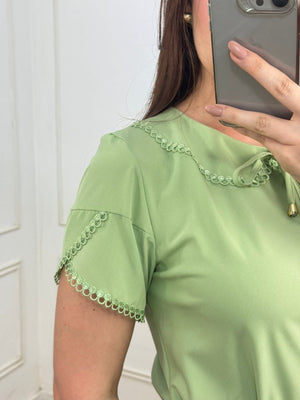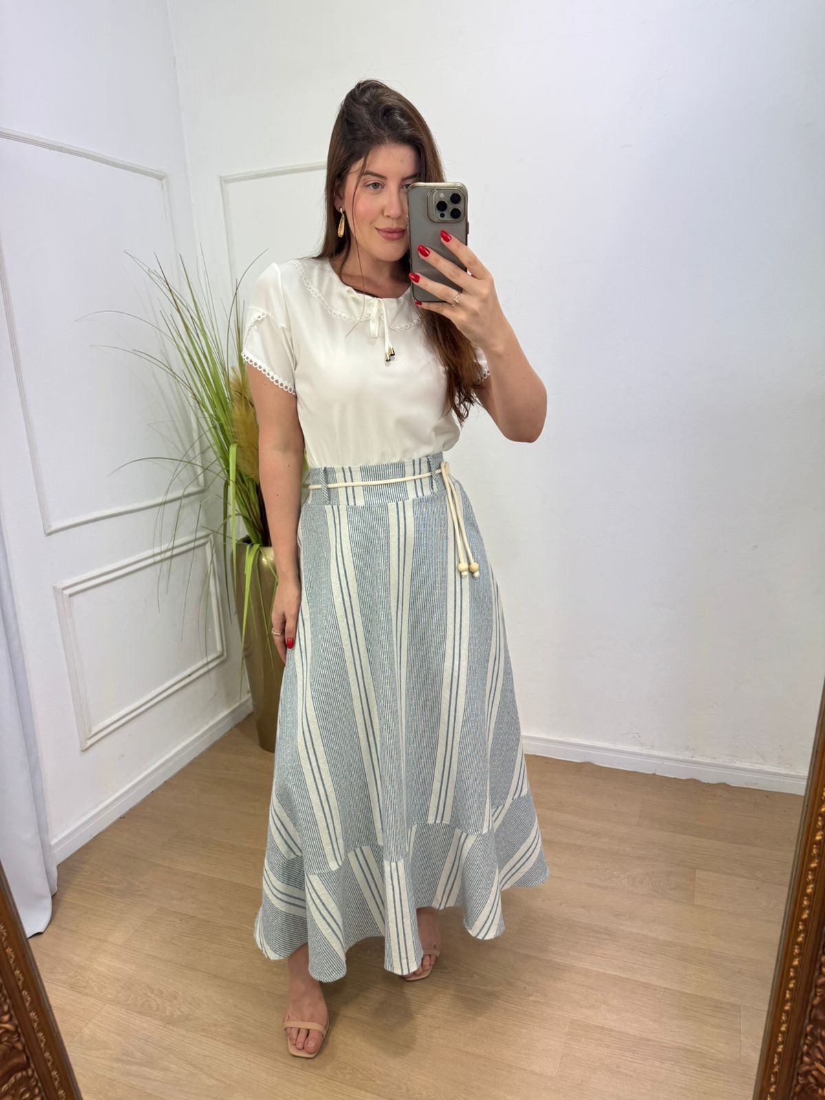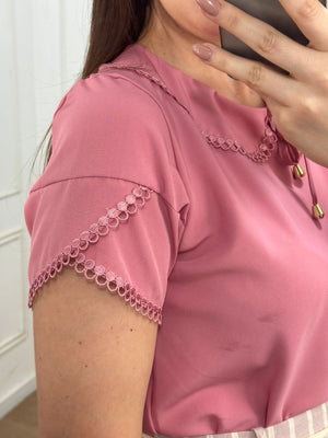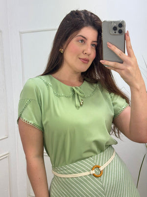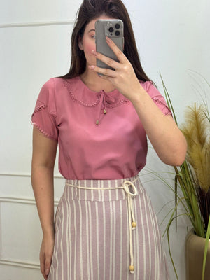Blusa no tecido crepe 100% poliéster detalhe na gola e mangas.