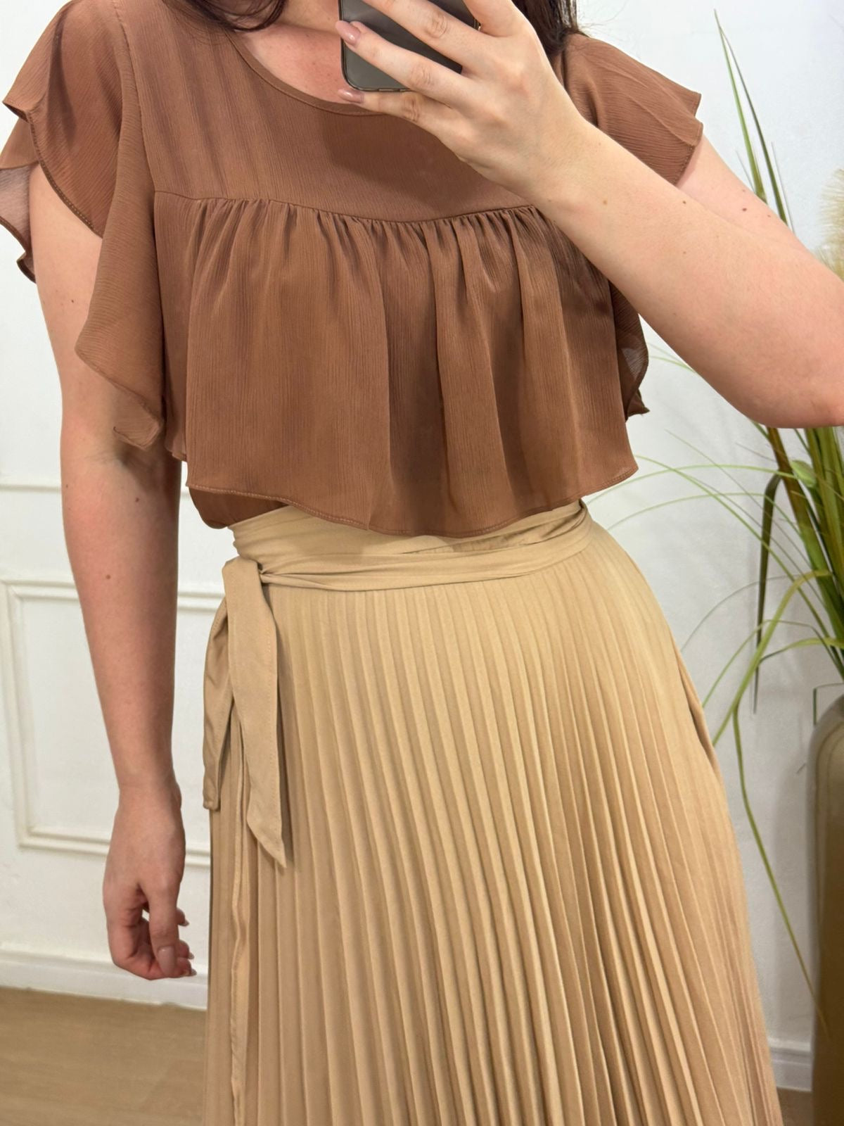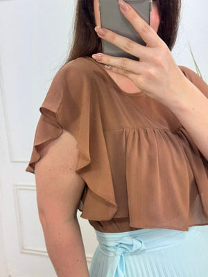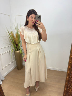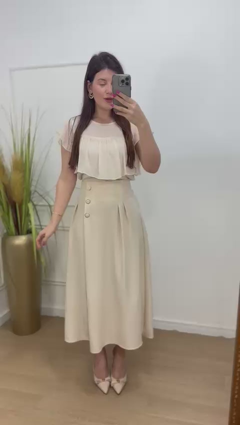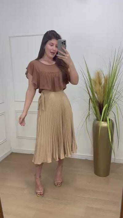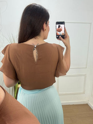 Blusa no crepe com detalhe em babados, botão na parte de trás leve fluida.