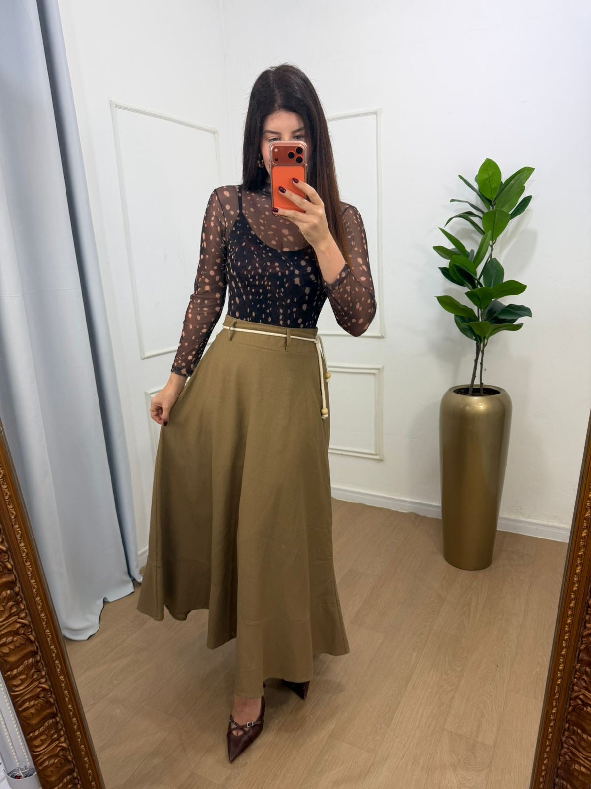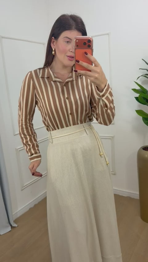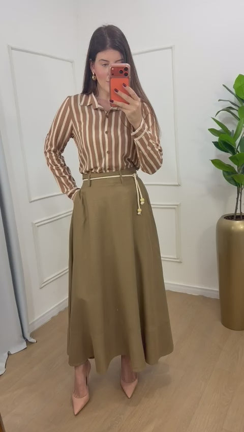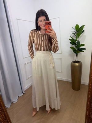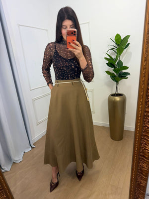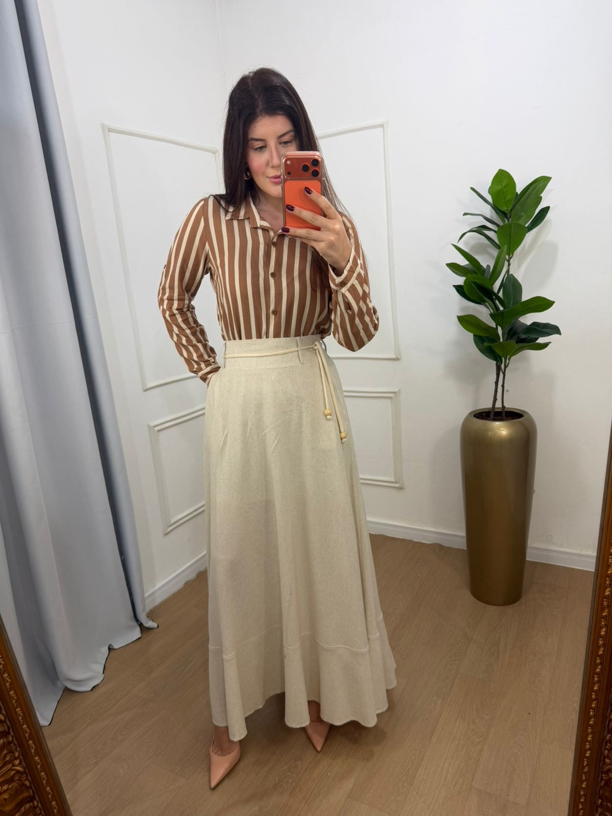 Saia no linho com toque de algodão forrada, possui bolsos e acompanha cinto, elástico na parte de trás