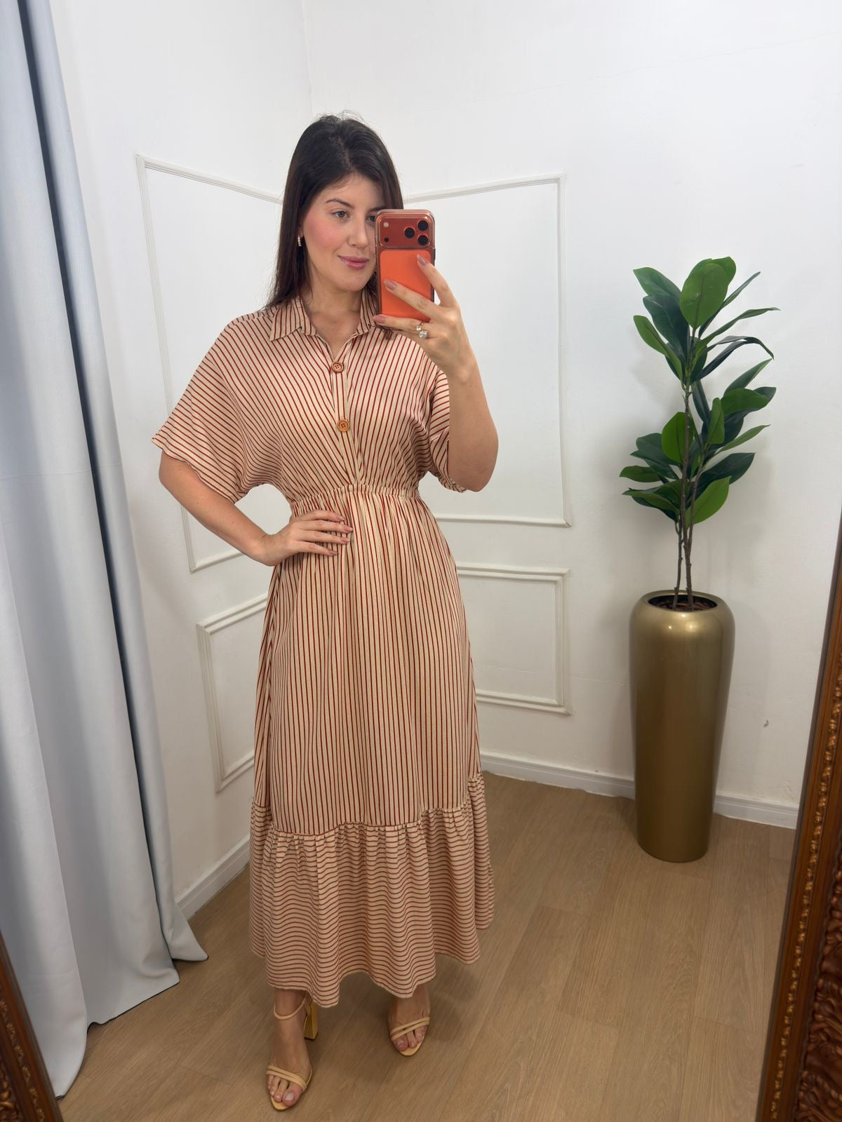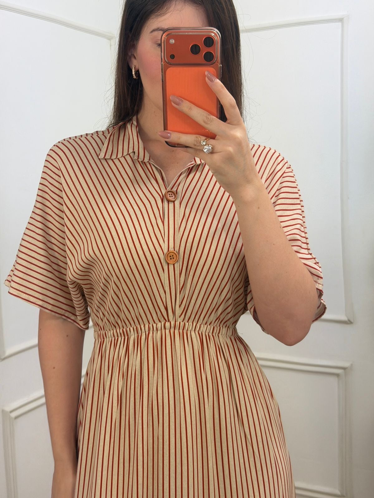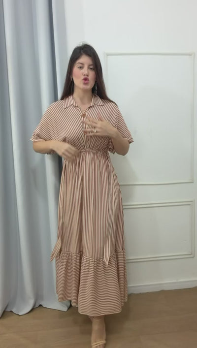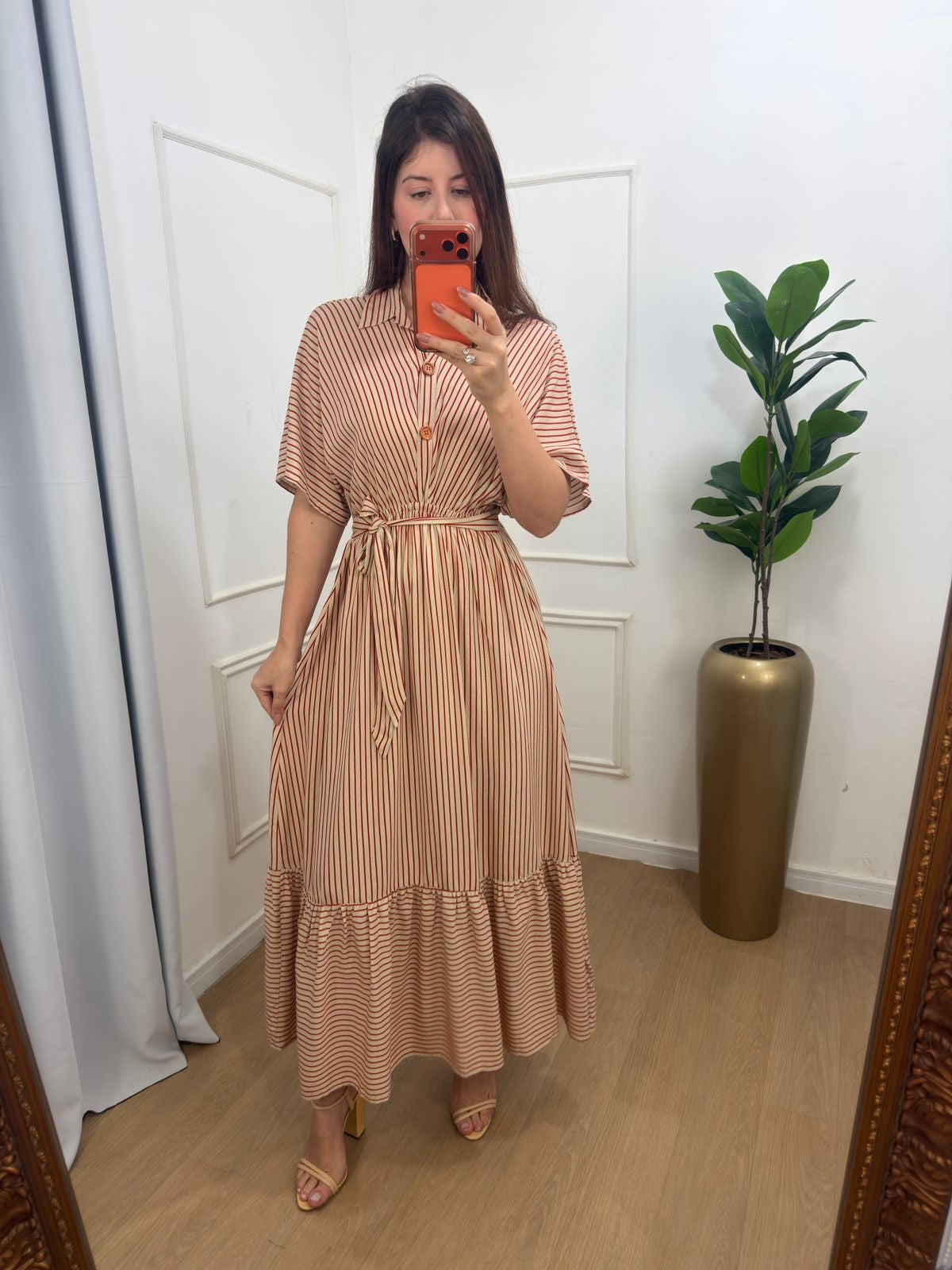 Vestido na viscose forrado na saia, elástico cintura, faixa e os botões funcionais no busto.