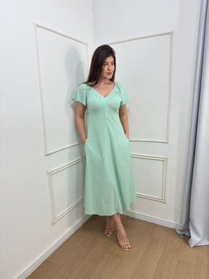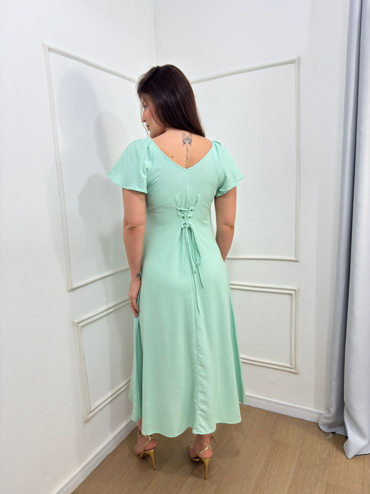 Vestido em linho modelagem evasê amarração na parte das costas, possui bolsos, decote levemente V.