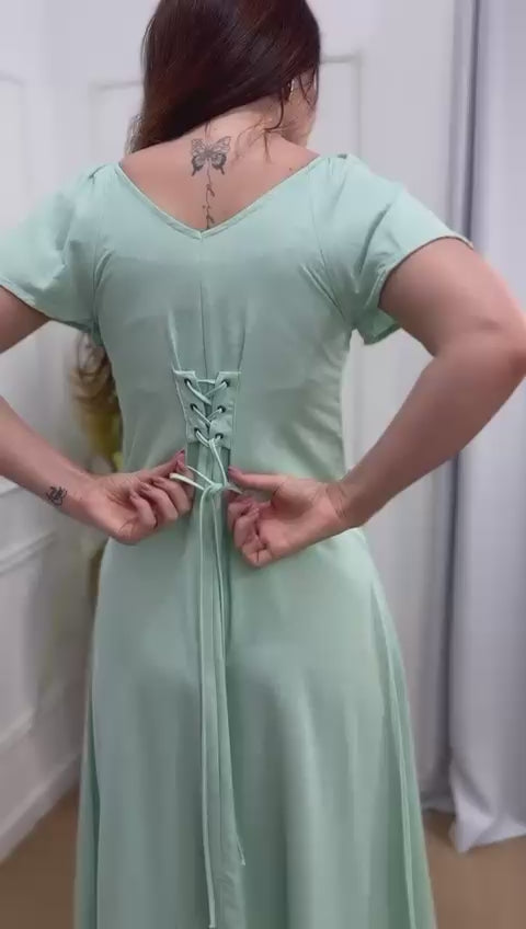 M: 96cm a 102cm de busto, 76cm a 80cm de cintura, 129cm de comprimento.