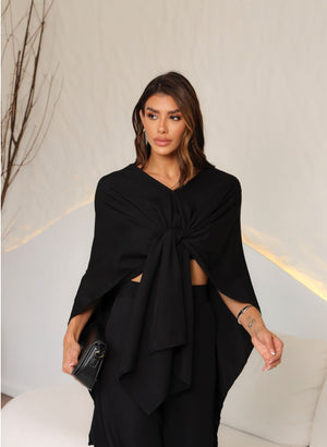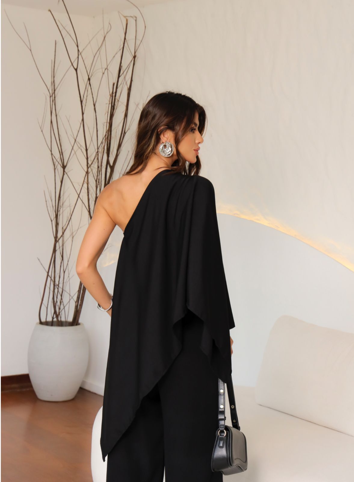 Acompanha capa moderna, que pode ser usada de diversas formas — sobre um ombro, nos dois ou como sobreposição, permitindo várias combinações em um único look.