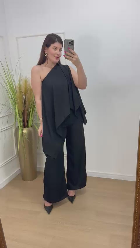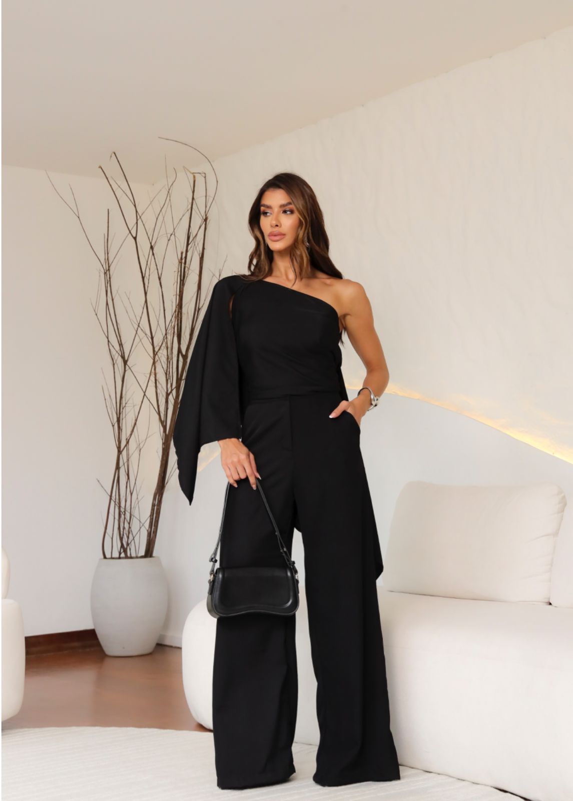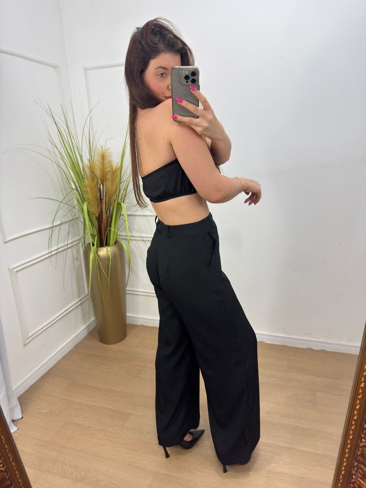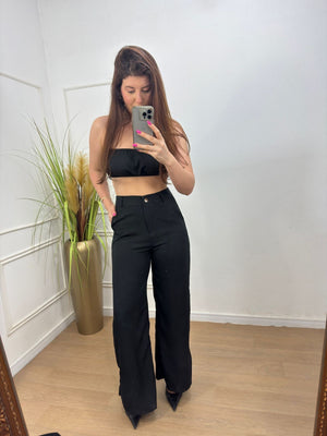 A calça possui bolsos laterais funcionais e modelagem pantalona, garantindo conforto e sofisticação.