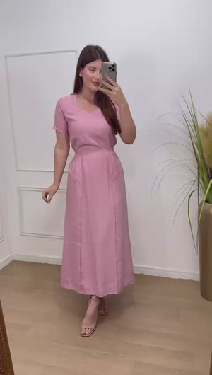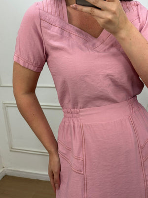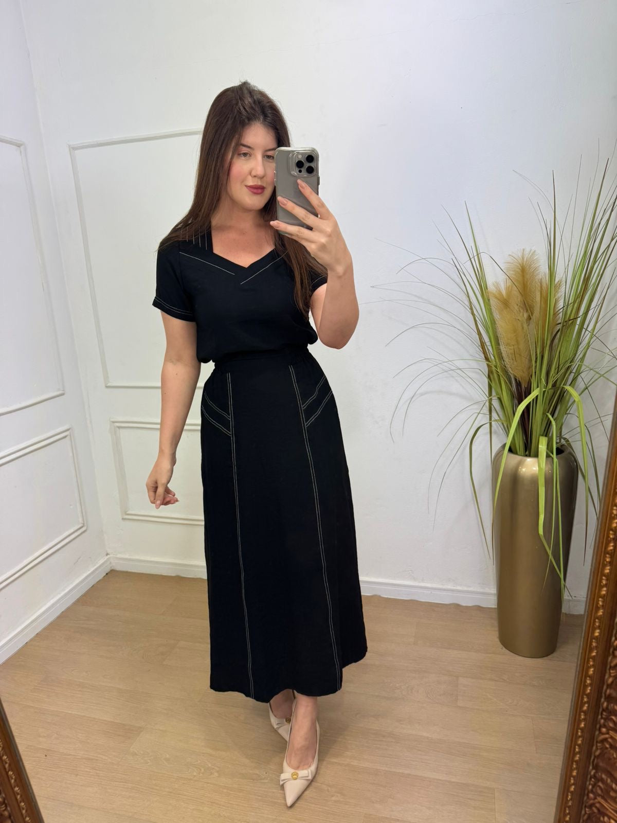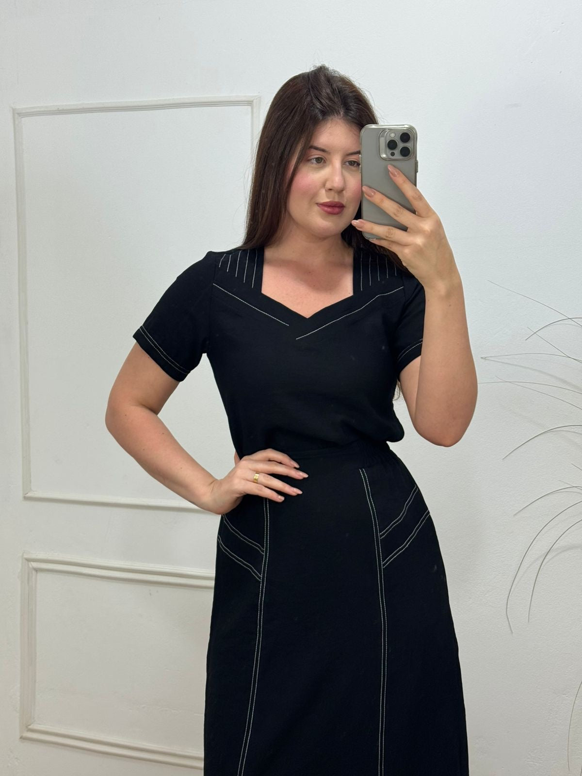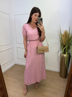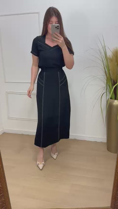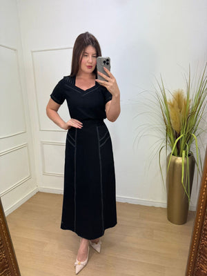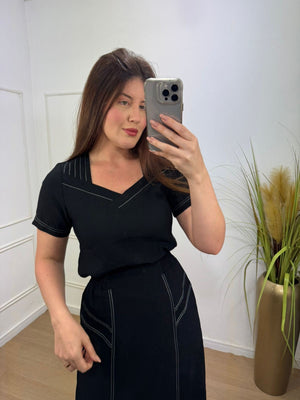 Conjunto no sensorial crepe com detalhes de costura aberta onde da todo charme na peça, elástico na saia na parte das costas.
