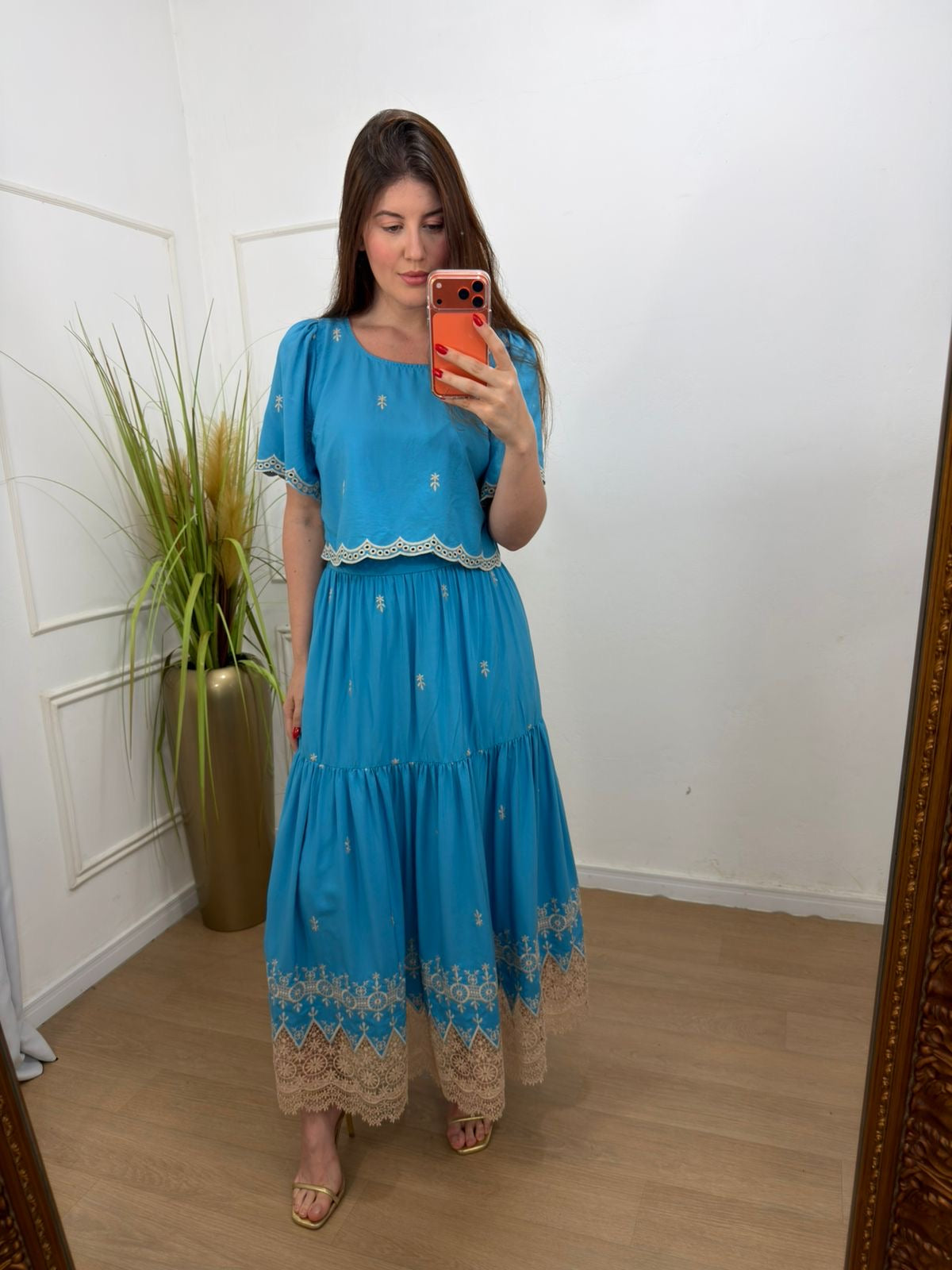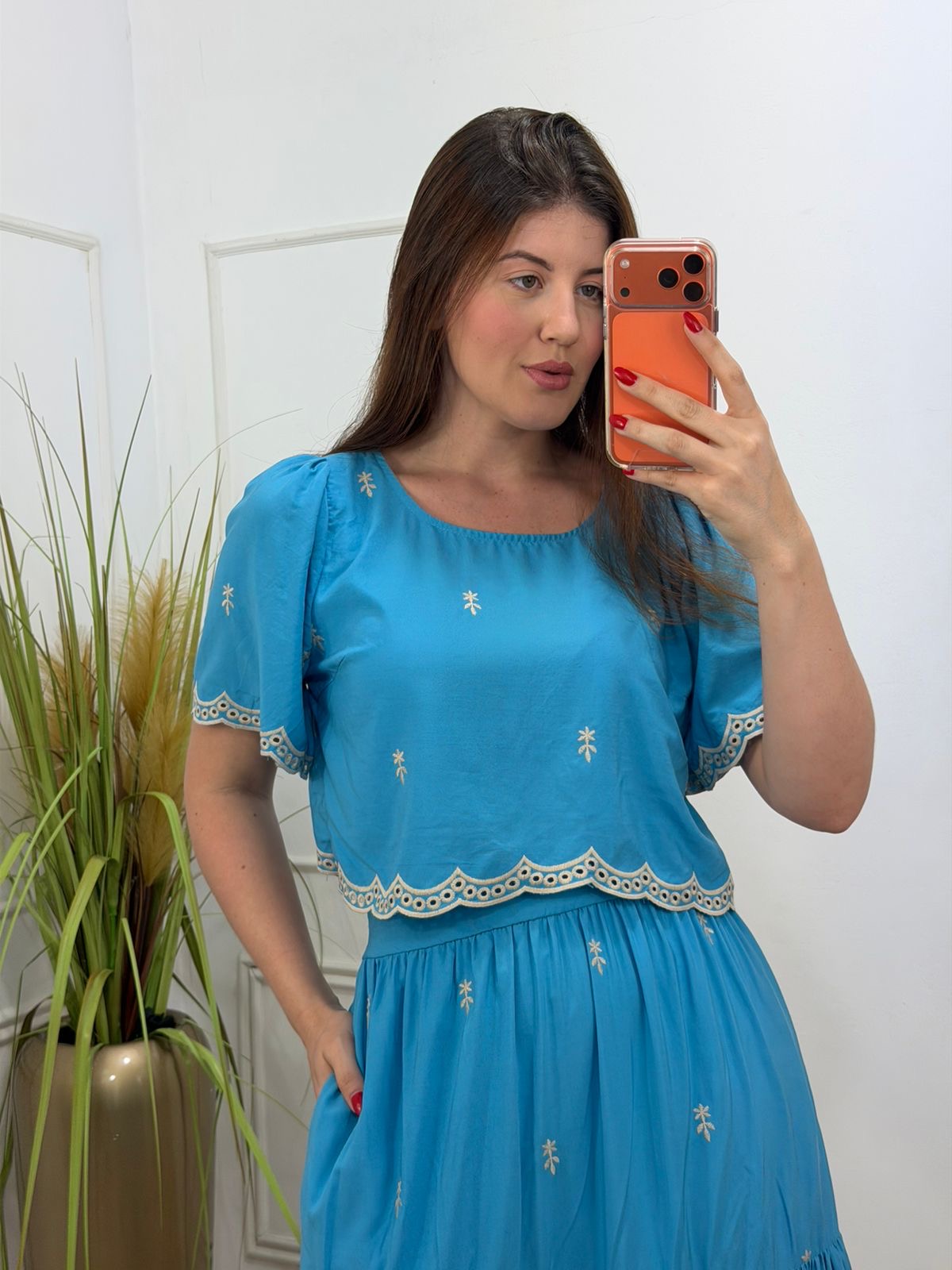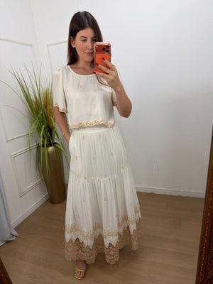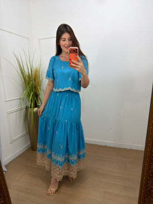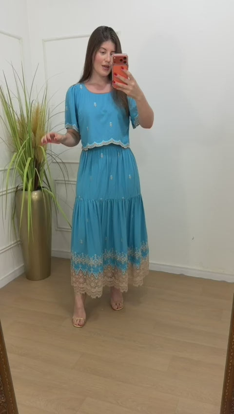 O charme fica por conta do bordado minucioso e dos detalhes em guippir presentes nas mangas, na barra da blusa e no acabamento da saia — um toque artesanal que transforma o conjunto em uma peça especial.
