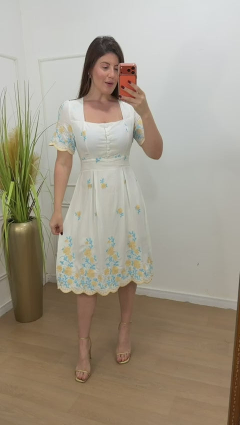 Vestido no viscolinho premium bordado botões forrado