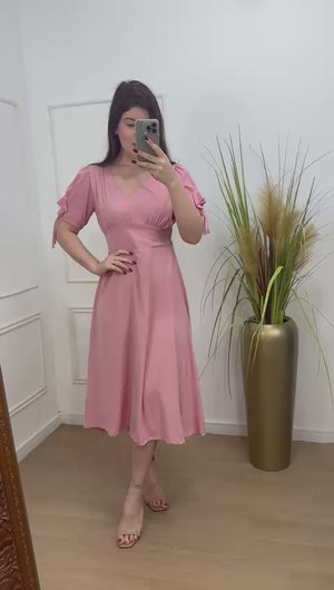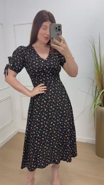 Vestido forrado no viscolinho premium lastex nas costas, amarração na manga modelagem evasê.