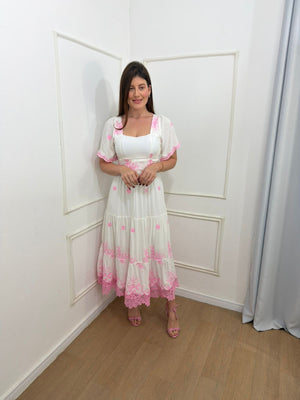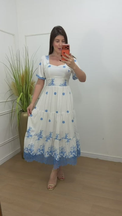 Vestido no viscolinho premium bordado com detalhes em Leze , possui bojo, elástico nas costas e forro na parte da saia.