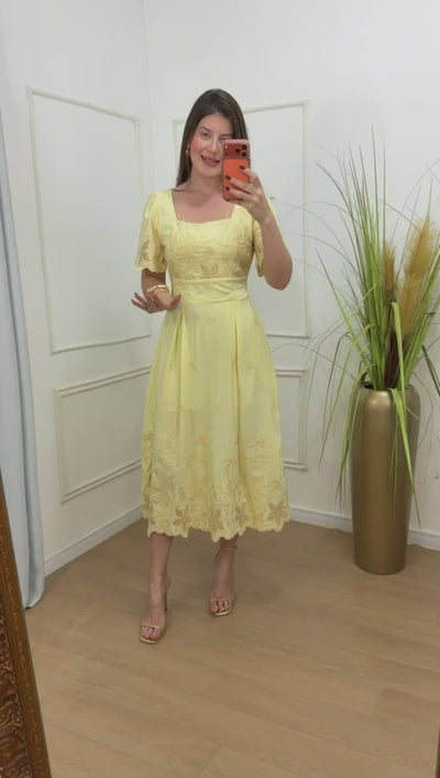 O modelo conta com lastex nas costas, que proporciona melhor ajuste ao corpo, além de bolsos funcionais, unindo charme e praticidade. A saia midi com bordado na barra e o decote quadrado valorizam a silhueta, tornando a peça perfeita para ocasiões especiais, almoços, eventos diurnos ou produções mais elegantes do dia a dia.