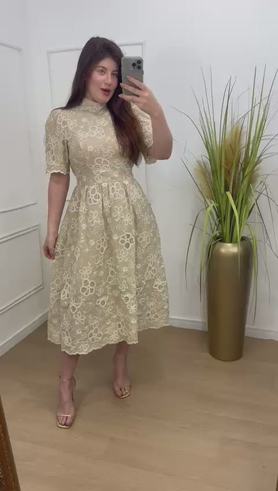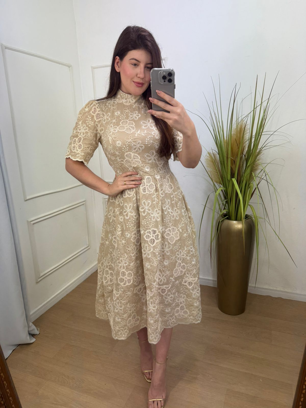 Vestido 100% algodão no lese possui forro, delhes em botões atrás.