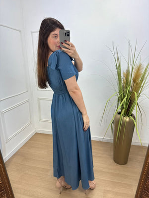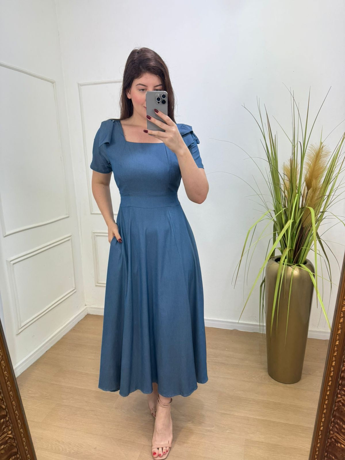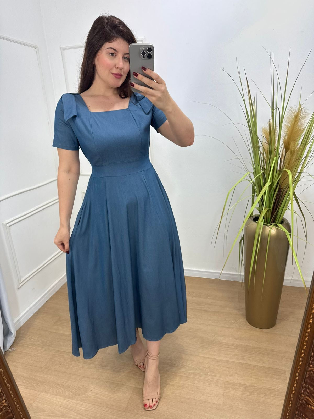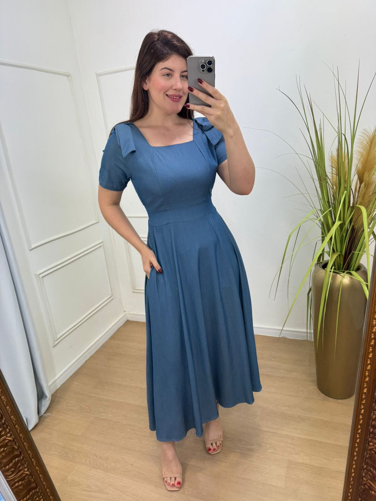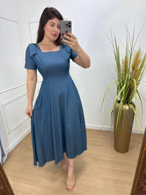 Vestido na sarja jeans tecido fluido , leve com bastante caimento , detalhe em laço nos ombros e lastex nas costas.