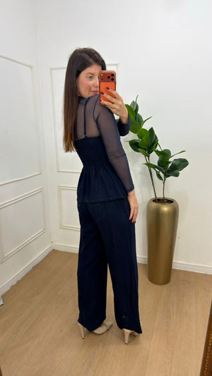 Conjunto na Alfaitaria sensorial composto de calça cos alto e colete de botões .