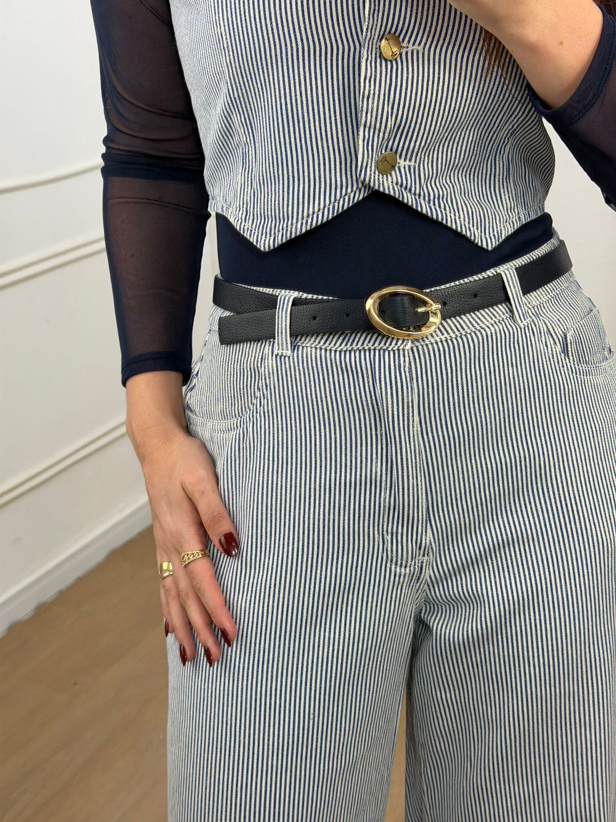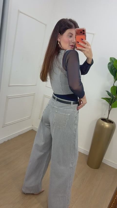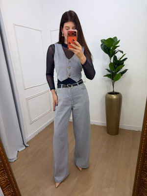 Confeccionado em jeans listrado 100% algodão, o conjunto traz um visual sofisticado e atemporal. O colete possui botões funcionais, que valorizam a modelagem e deixam o look ainda mais elegante.