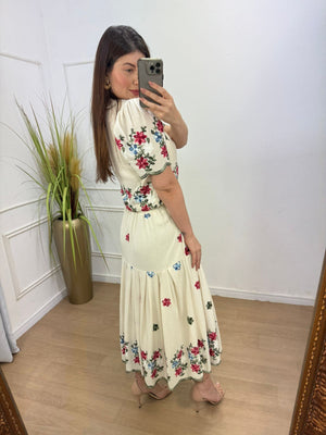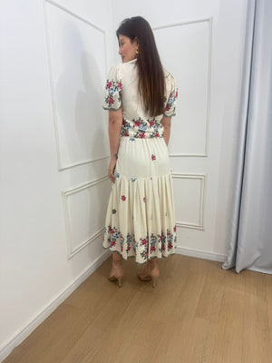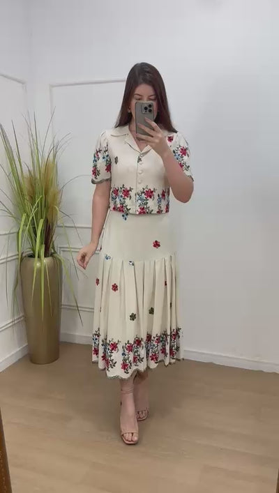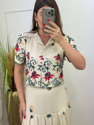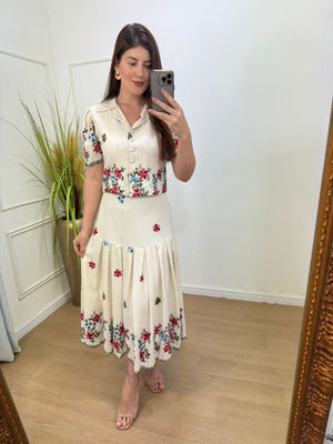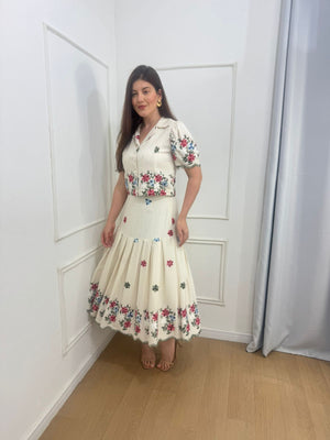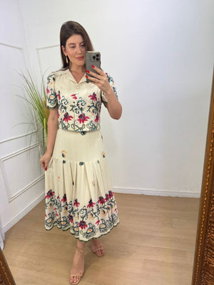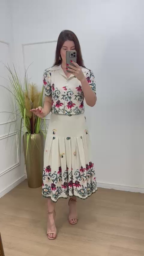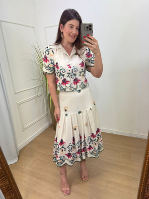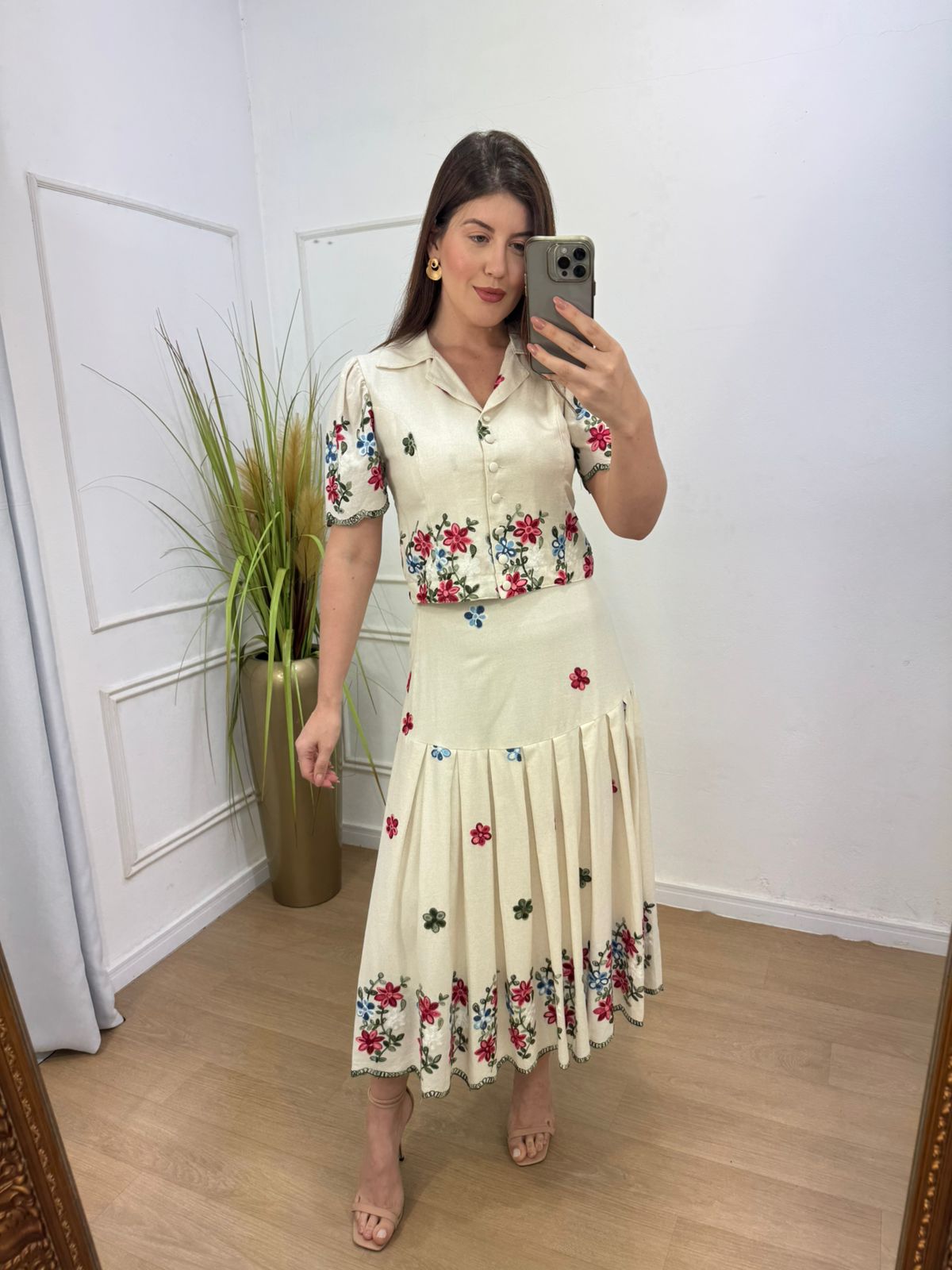 Conjunto no linho bordado, forrado, possui botões funcionais, elástico no cos da saia modelagem midi.