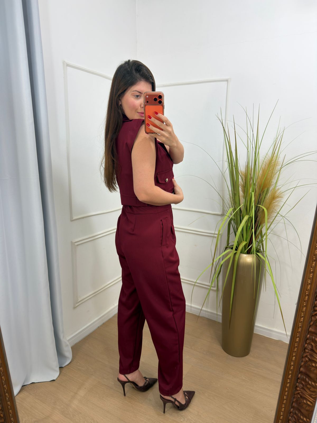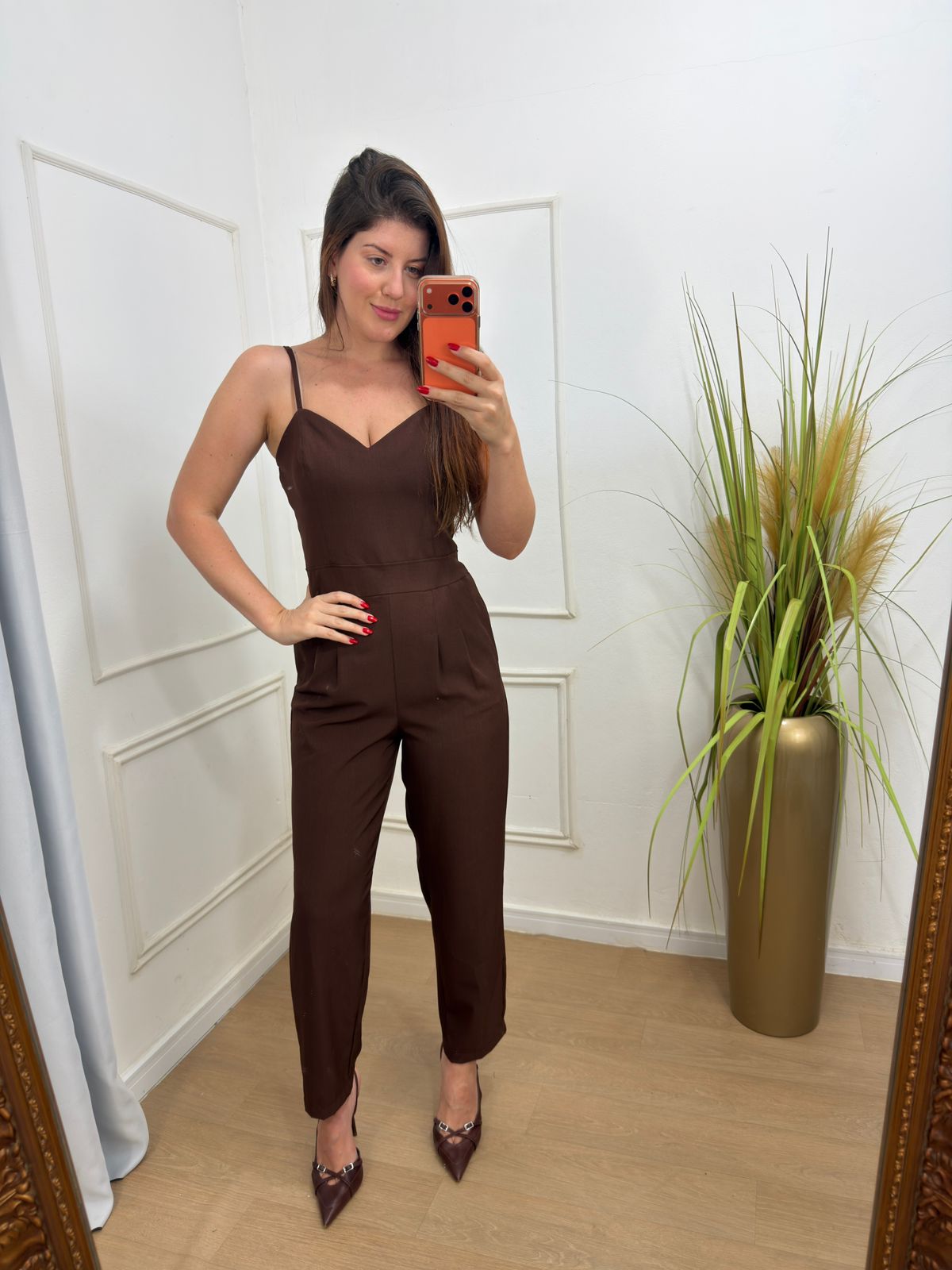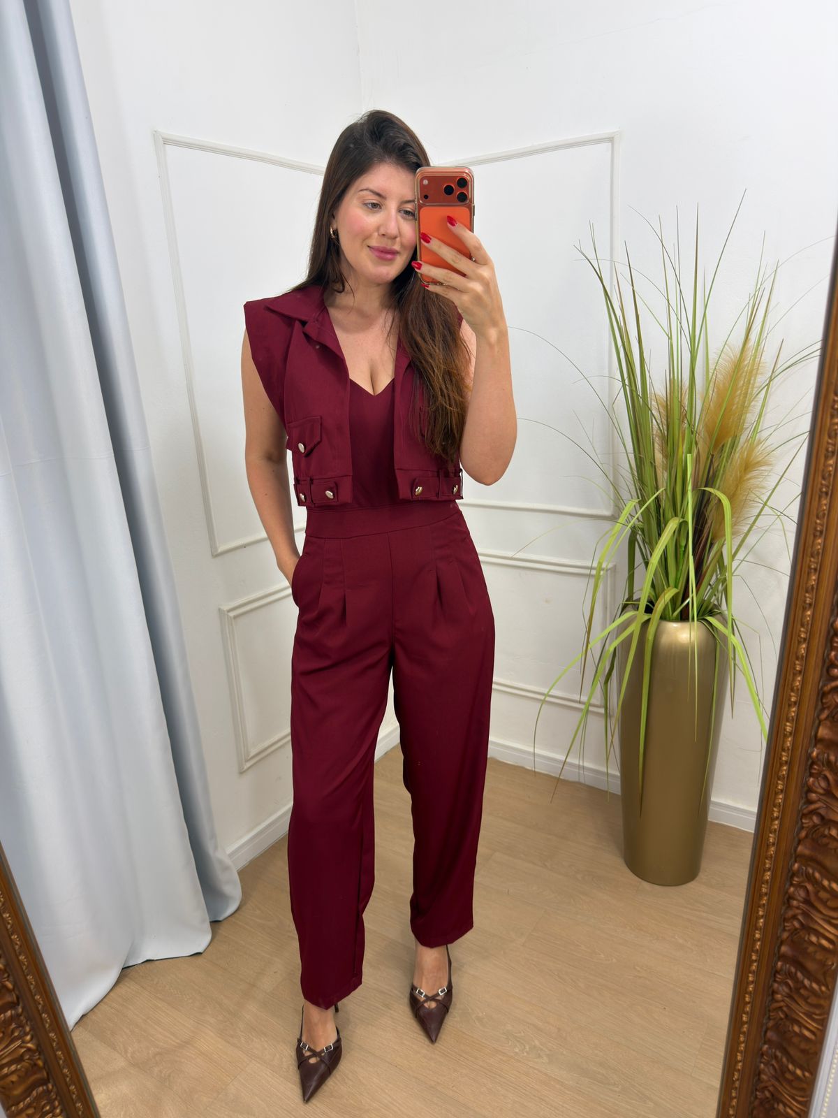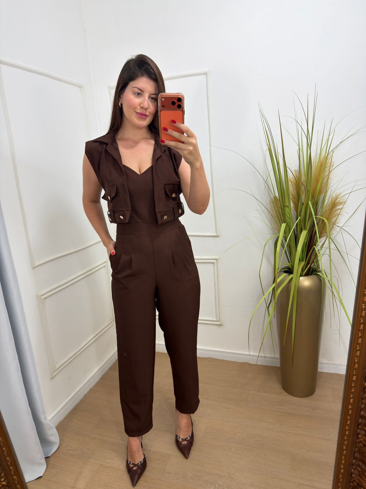 Macacão na alfaitaria crepe tecido encorpado possui bolsos, ele é de alça e acompanha casaqueto elástico na cintura na parte das costas e zíper.