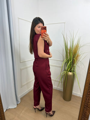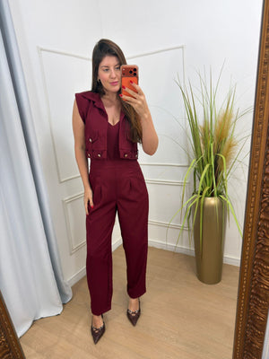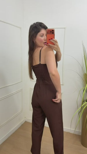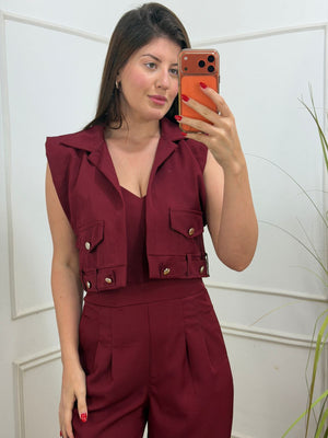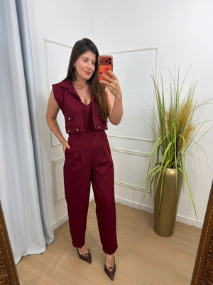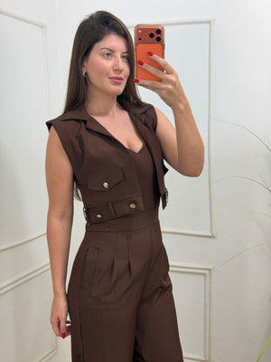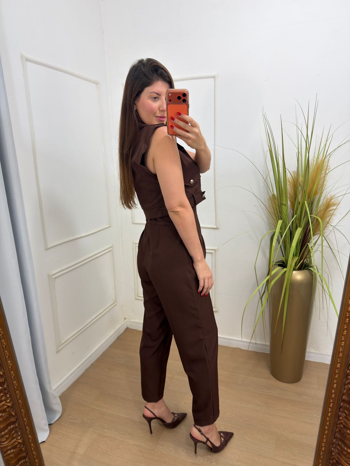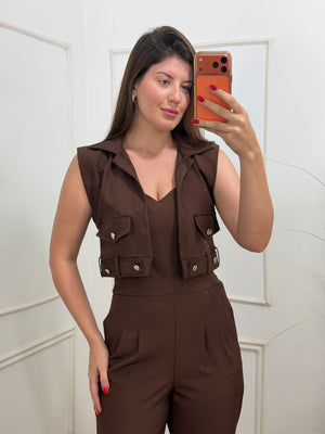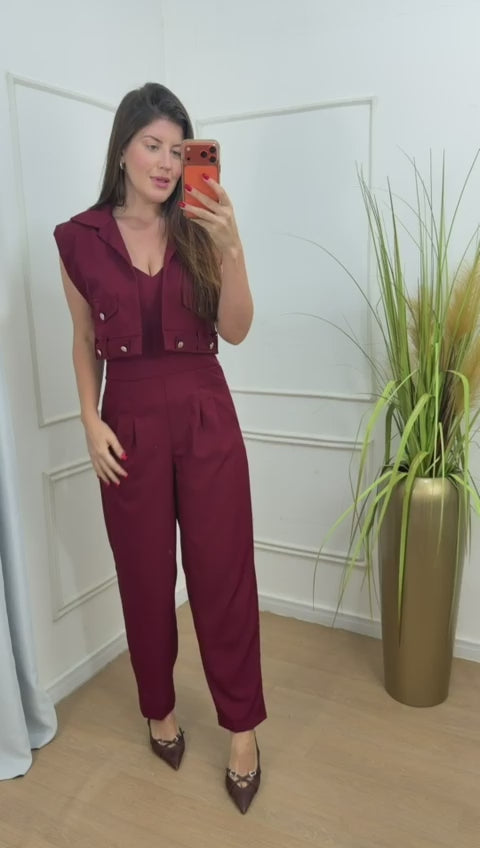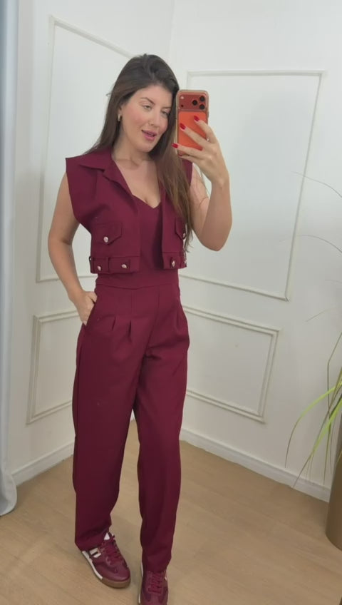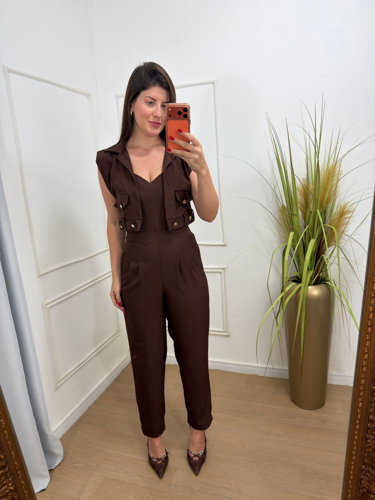 Macacão na alfaitaria crepe tecido encorpado possui bolsos, ele é de alça e acompanha casaqueto elástico na cintura na parte das costas e zíper.
