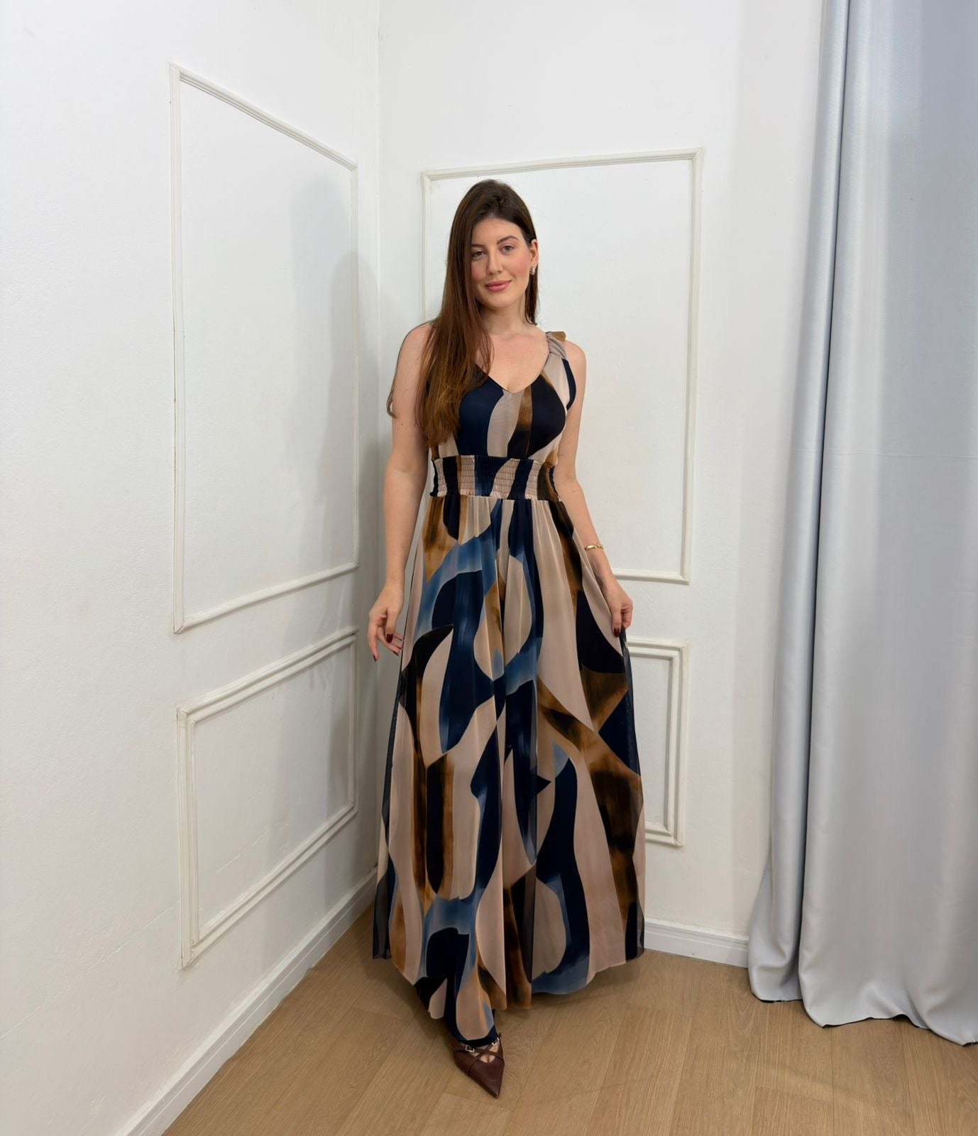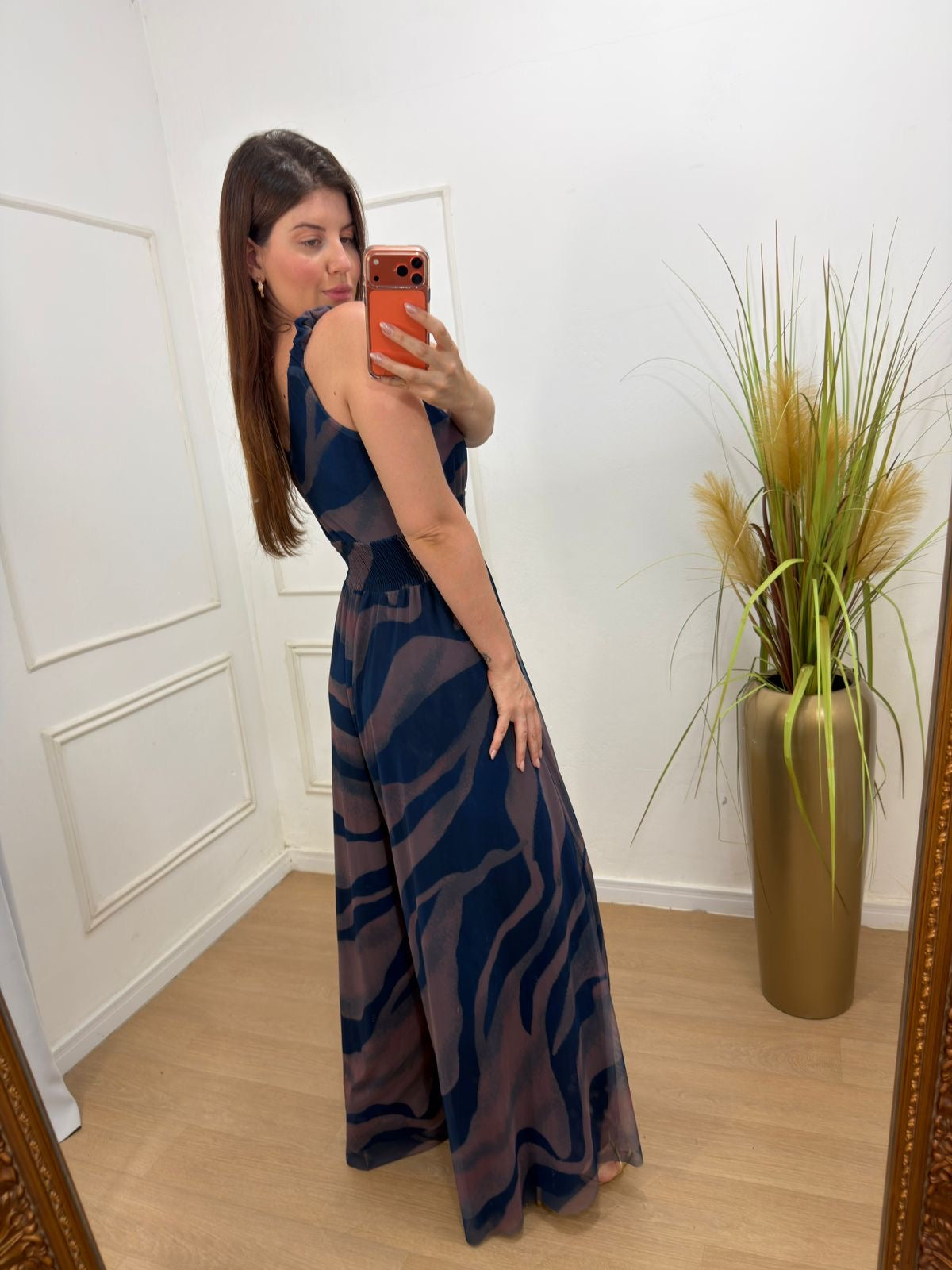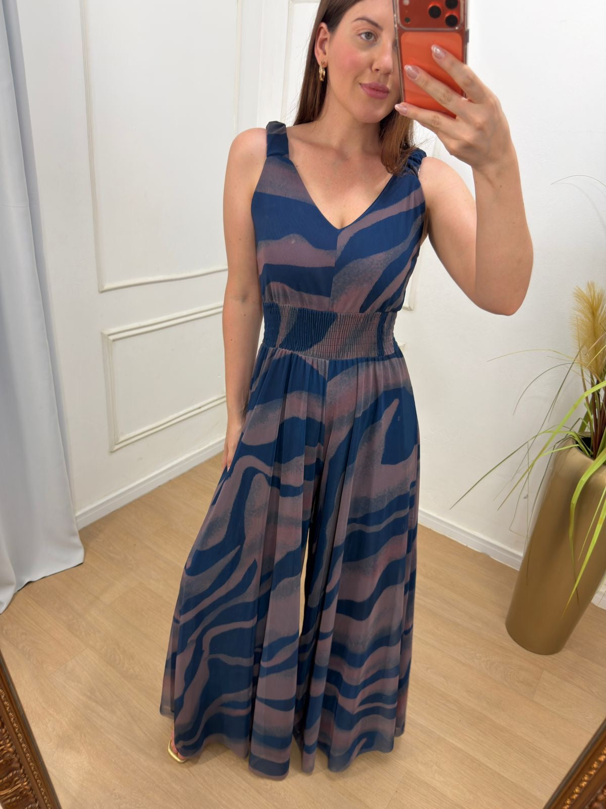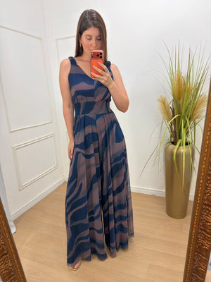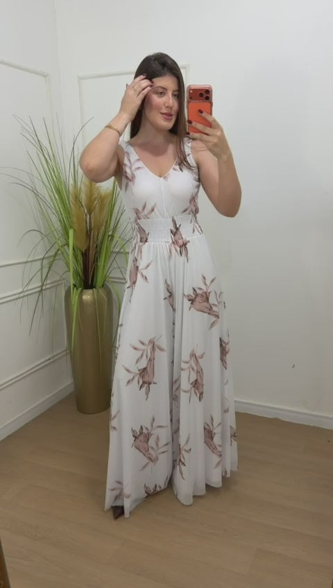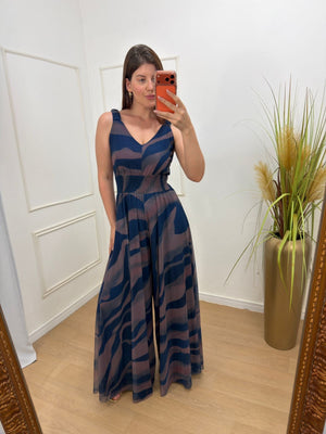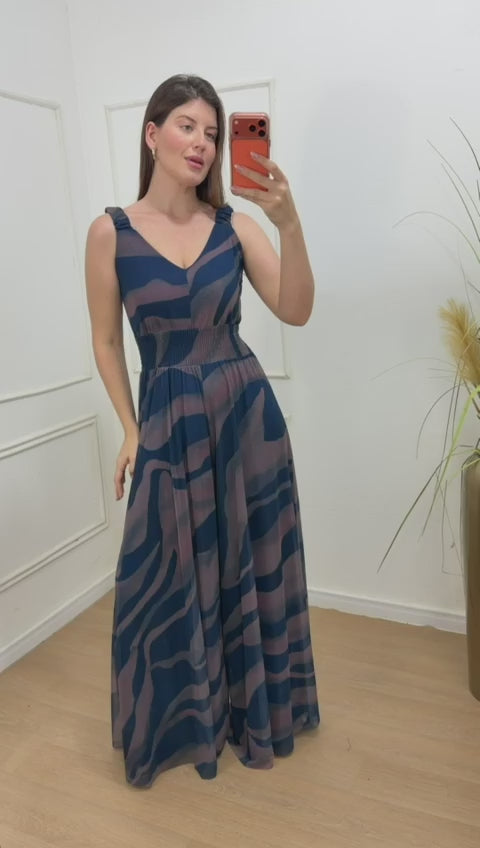 Macacão em tule, totalmente forrado em helanca com elastano, garantindo conforto e caimento impecável. Possui lastex na cintura, alças largas que permitem o uso com sutiã, decote em “V” suave e modelagem pantalona, que alonga a silhueta e traz elegância ao look.