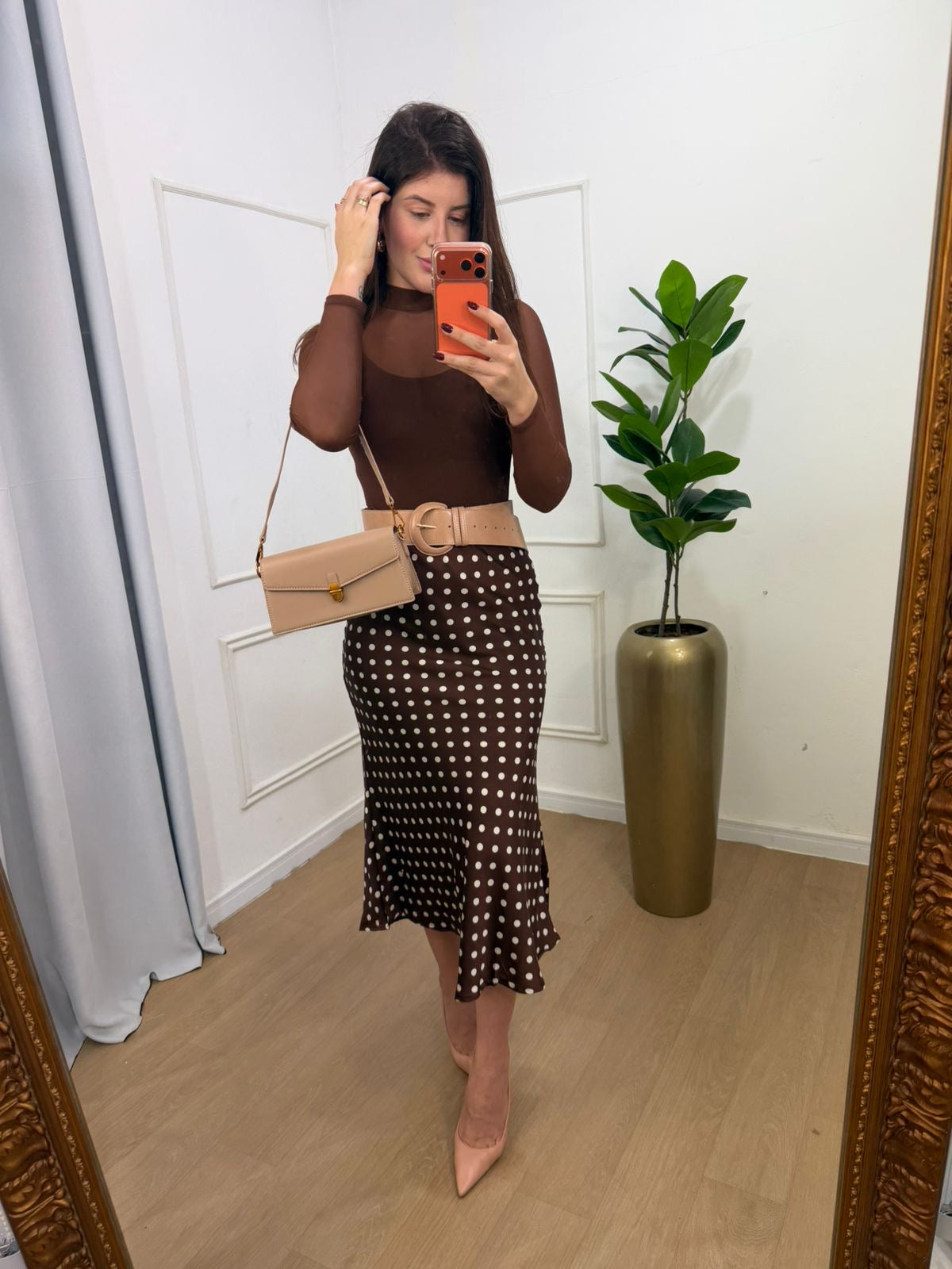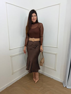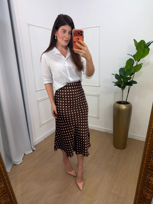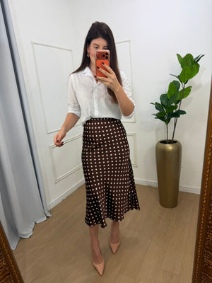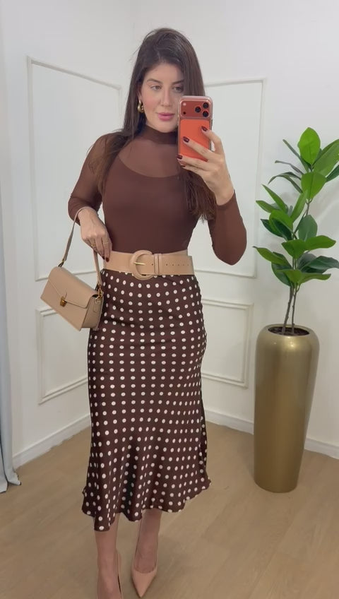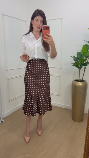 Saia em cetim, elástico no cós, modelagem sereia.