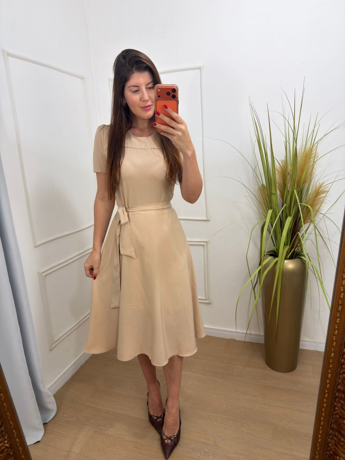 Vestido na alfaitaria crepe com zíper nas costas possui forro, acompanha faixa e possui detalhe em guippir no busto.