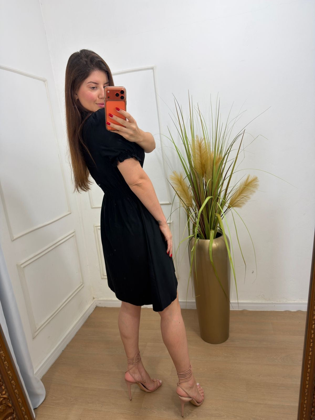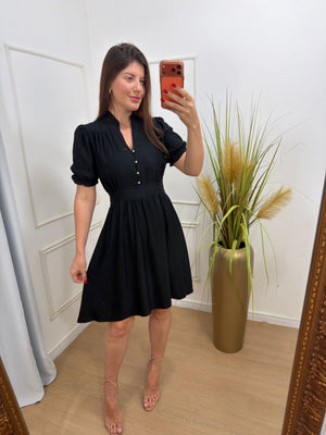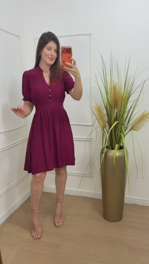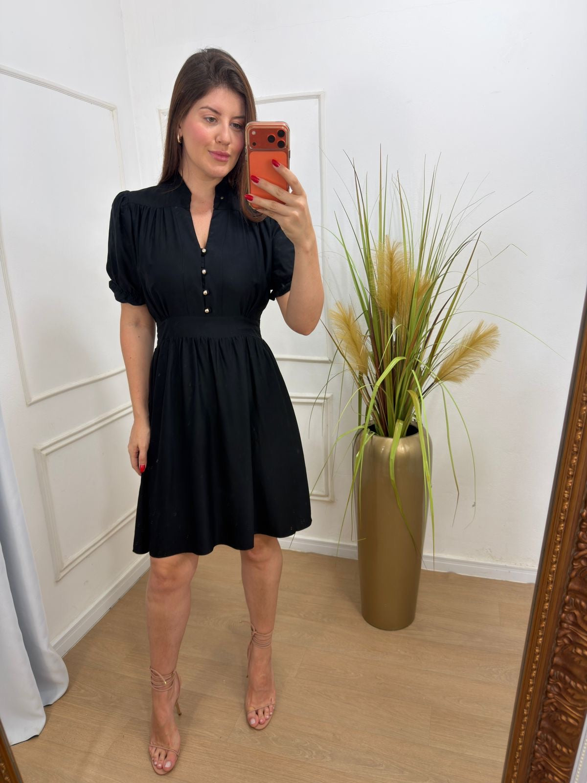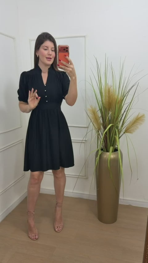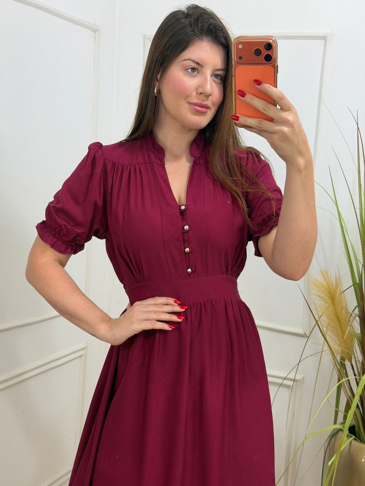 Vestido no tecido viscose sarjado possui forro na saia, lastex nas costas, botões funcionais elástico na manga e costas.