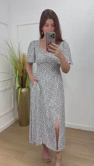 Vestido no viscolinho forrado com botões frontais lastex atrás, fenda frontal.