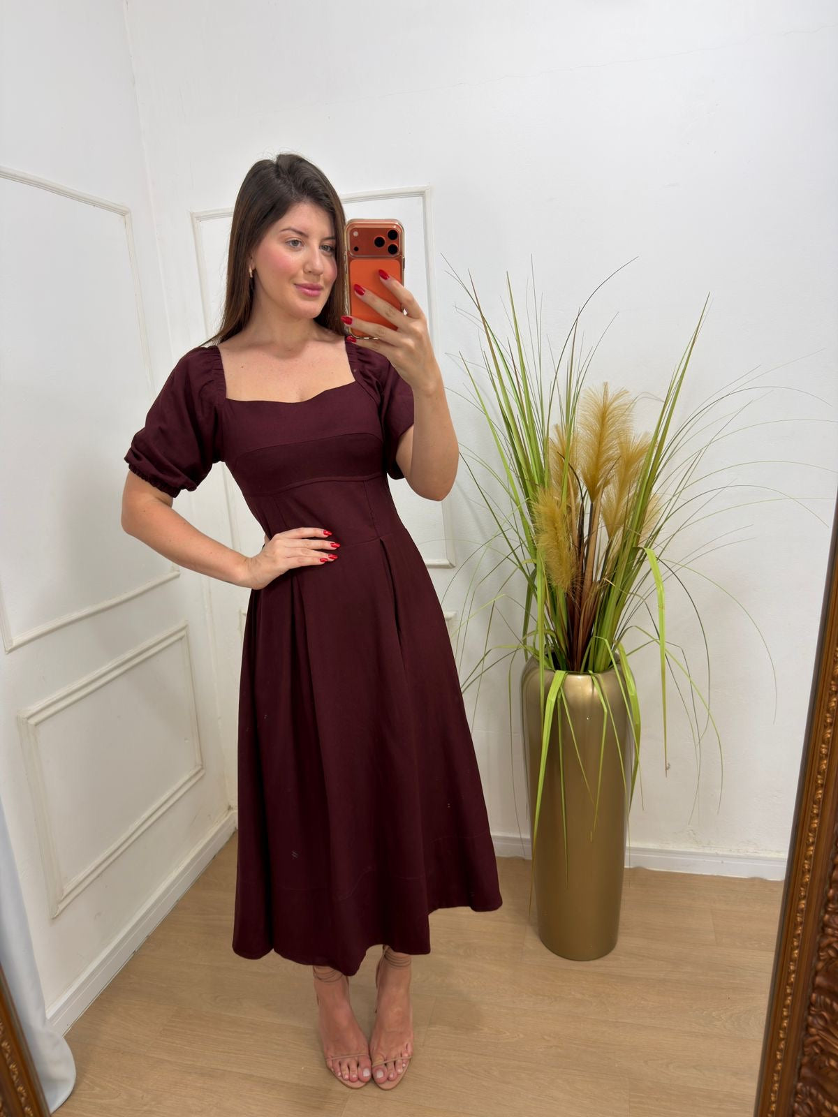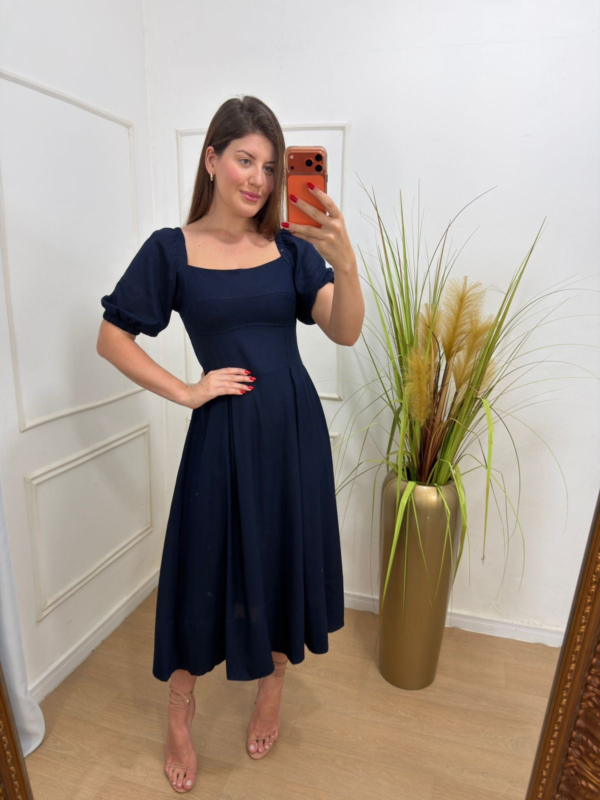 Vestido no linho pré lavado forrado elástico nas mangas , acinturado, tecido leve, possui forro na parte da saia.