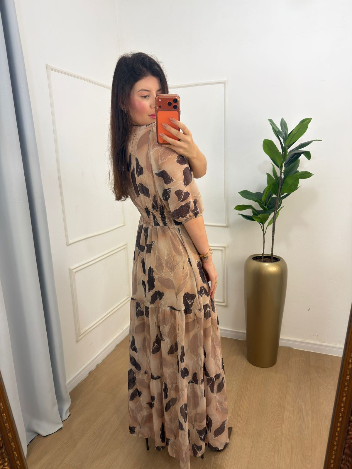A estampa de folhas em tons terrosos traduz toda a essência do outono, proporcionando um visual elegante e aconchegante. As mangas levemente bufantes e a saia em camadas conferem movimento e charme, tornando-o ideal para diversas ocasiões, desde passeios especiais até eventos mais sofisticados.