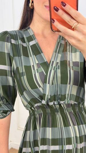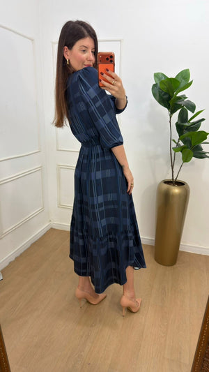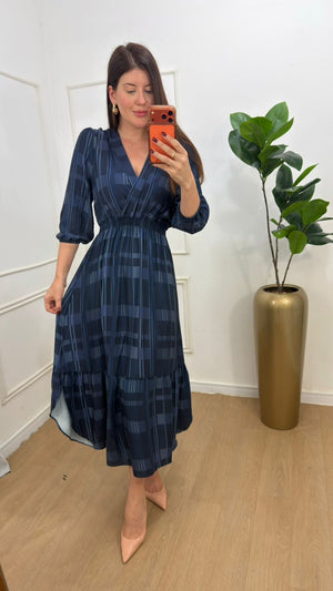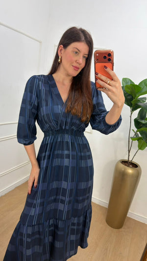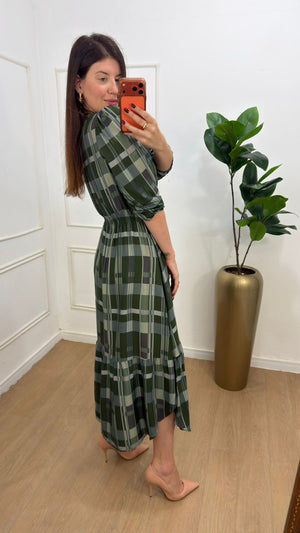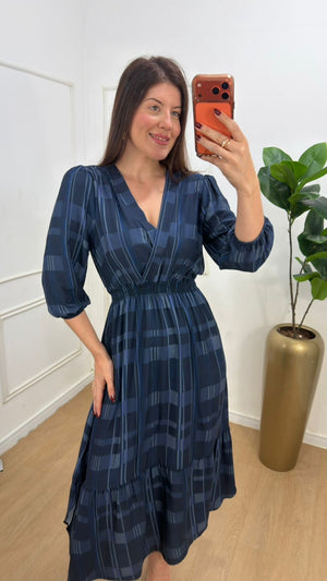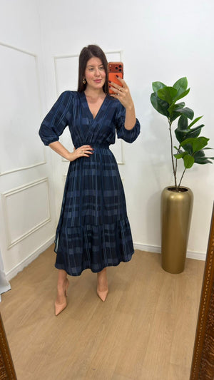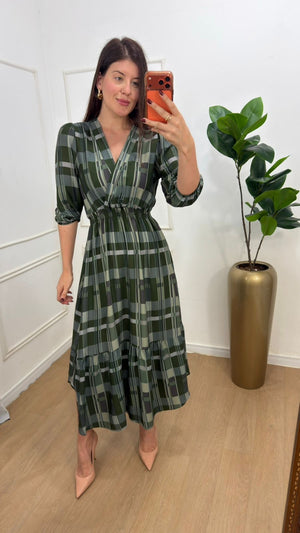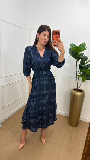 Vestido na viscose sarjada lastex na cintura não possui forro , modelagem mídi, decote transpassado.
