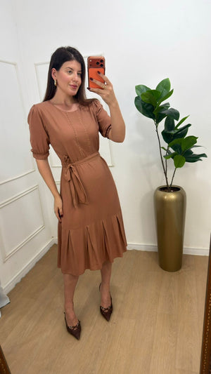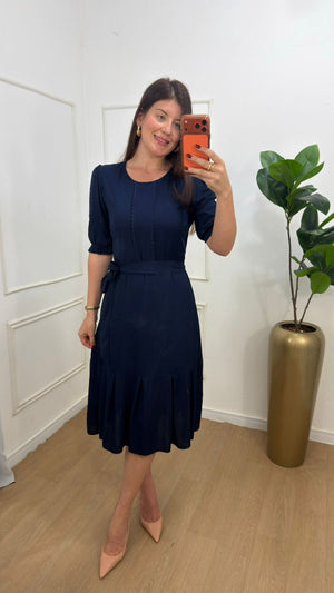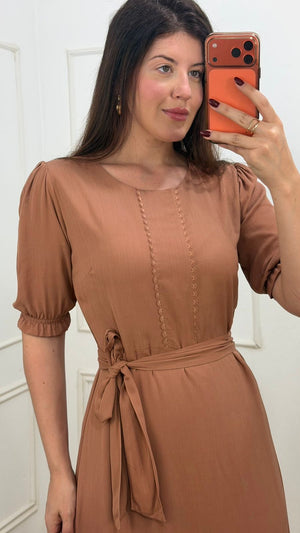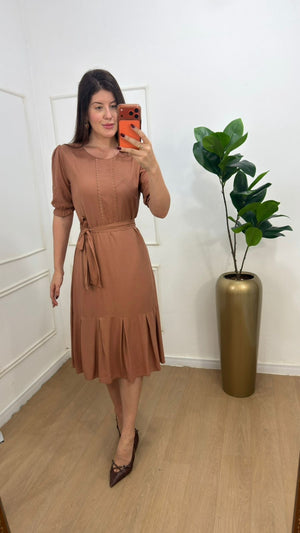 Vestido na viscose sarjada forrado e possui zíper , acompanha faixa, babado e manga 3/4