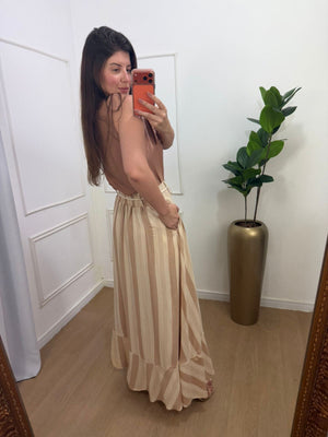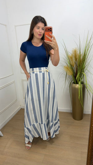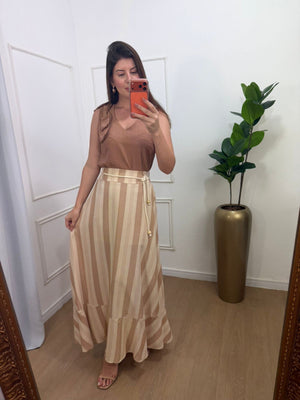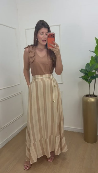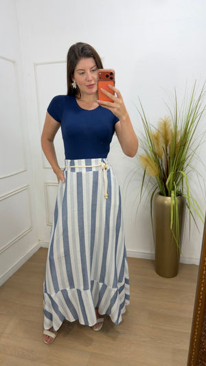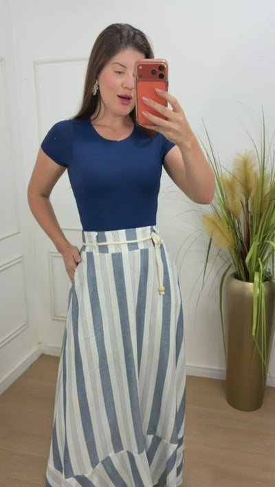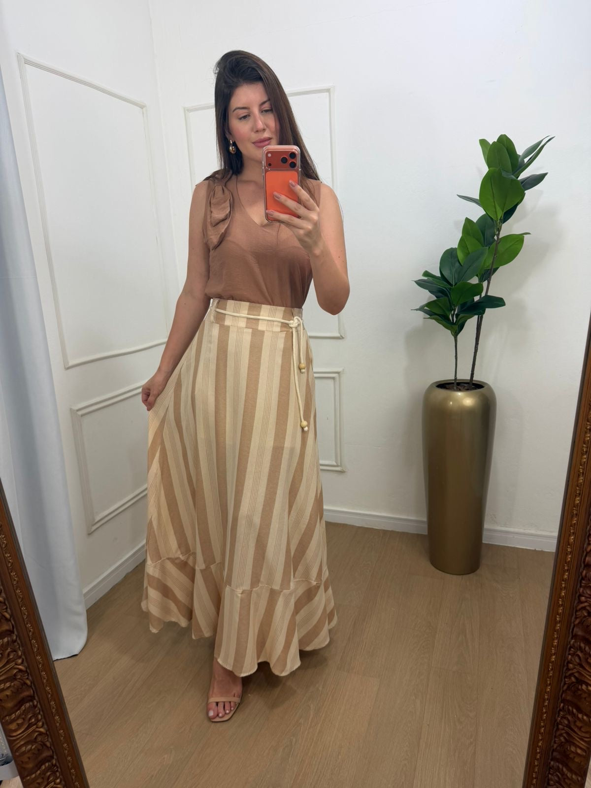 Saia no linho com toque de algodão forrada, possui bolsos e acompanha cinto, elástico na parte de trás