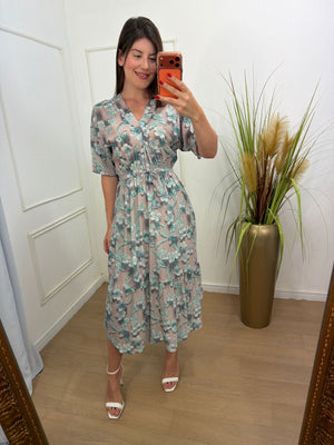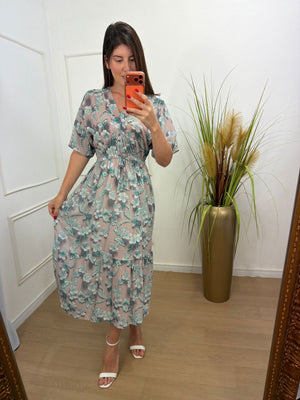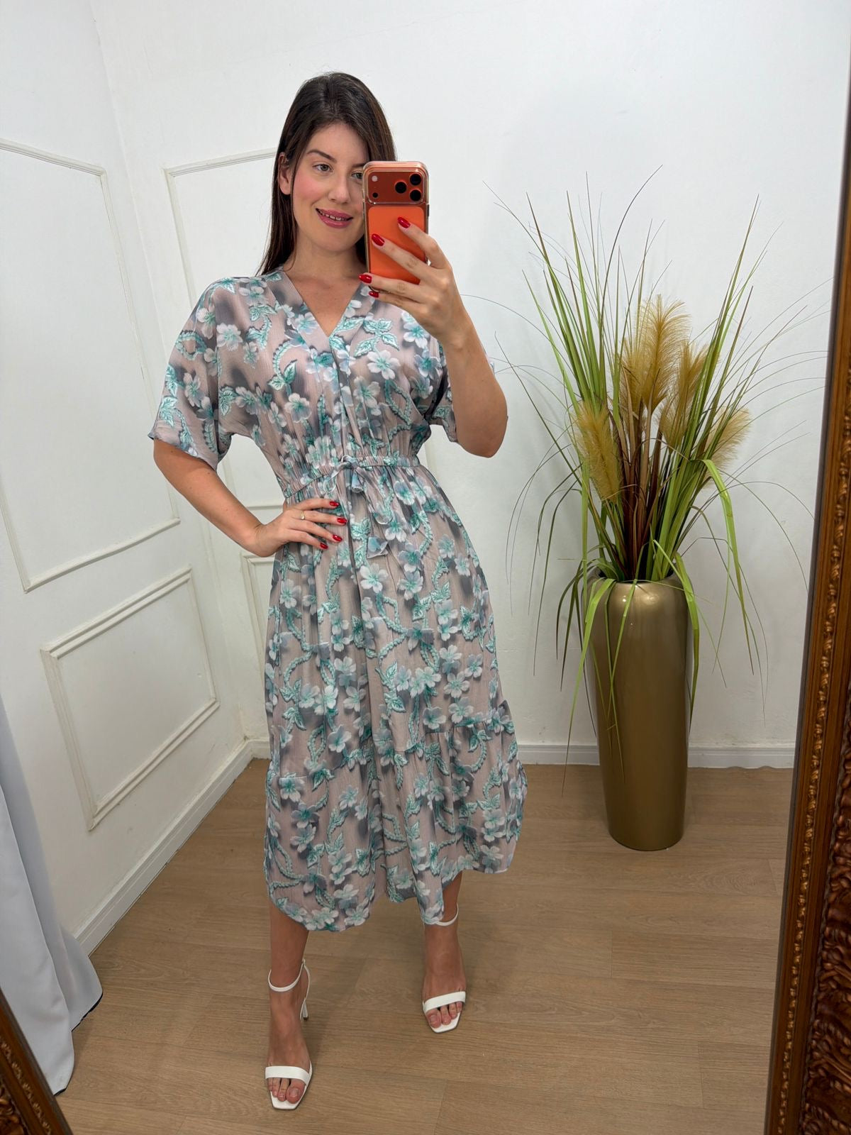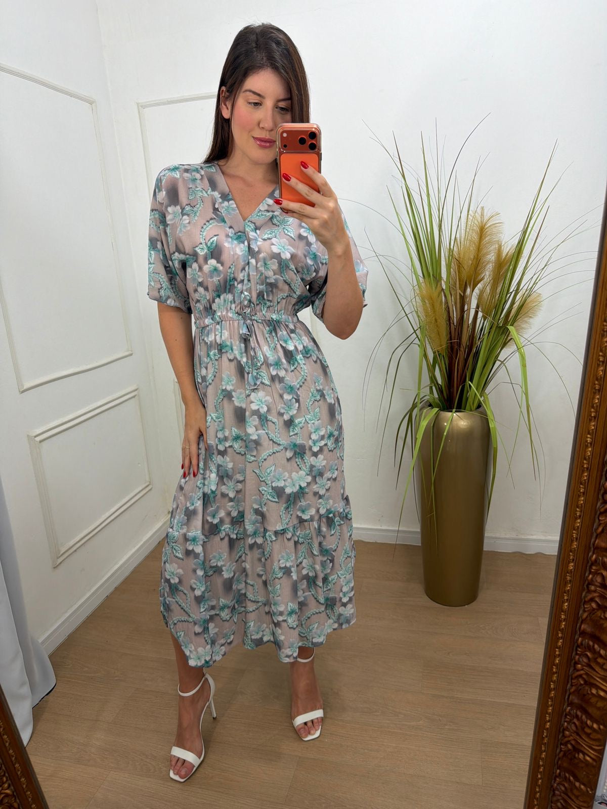 Vestido no crepe forrado, elástico na cintura, fluido.