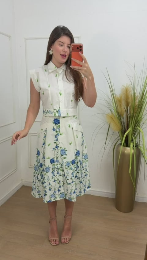 Conjunto 98% algodão 2% elastano, possui forro , botões funcionais , saia cos alto evasê modelagem midi.