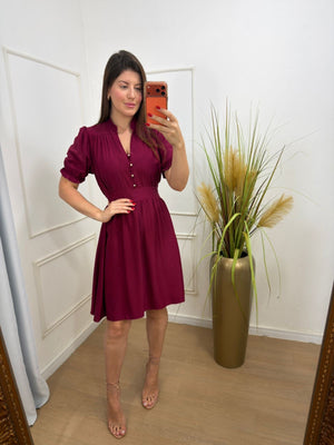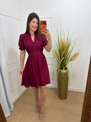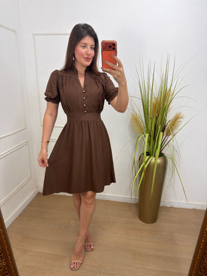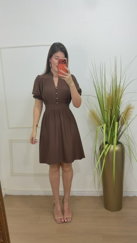 Vestido no tecido viscose sarjado possui forro na saia, lastex nas costas, botões funcionais elástico na manga e costas.
