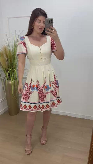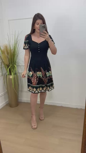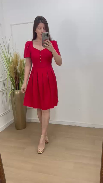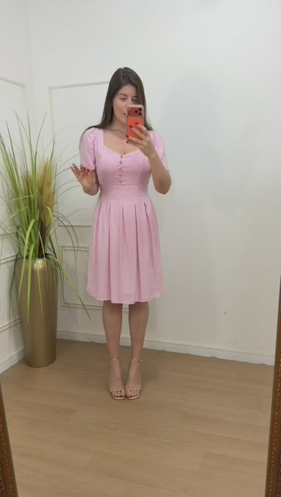 Vestido no viscolinho forrado botões funcionais com pregas na saia.