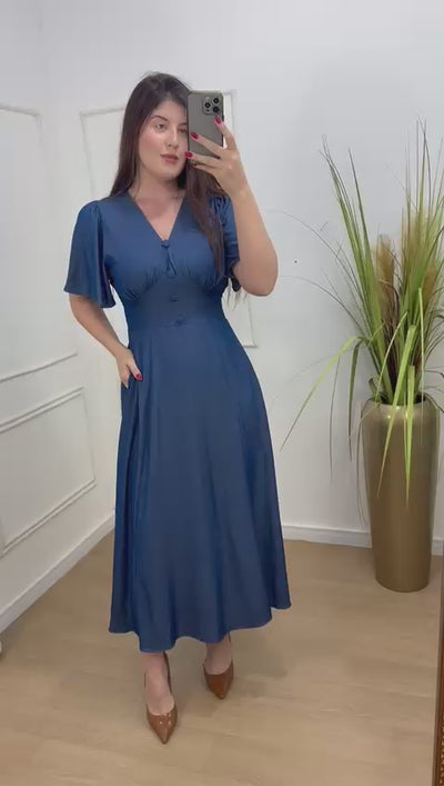 Descrição: vestido no jeans com elastano decote levemente V botões forrado manga lua.
