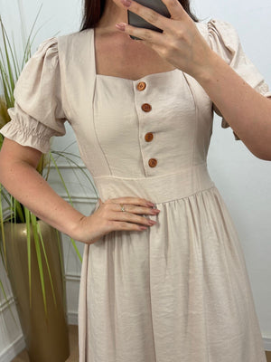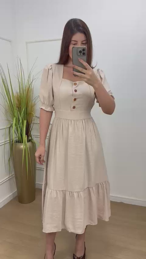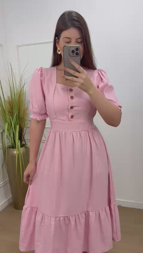 Vestido na alfaitaria sensorial crepe com botões funcionais, elástico na manga , lastex nas costas , babado na barra.