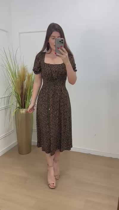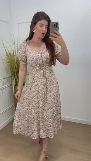 Vestido modelo camponesa com amarração frontal , lastex nas costas, forrado no tecido viscolinho.