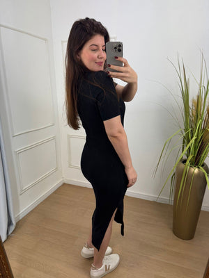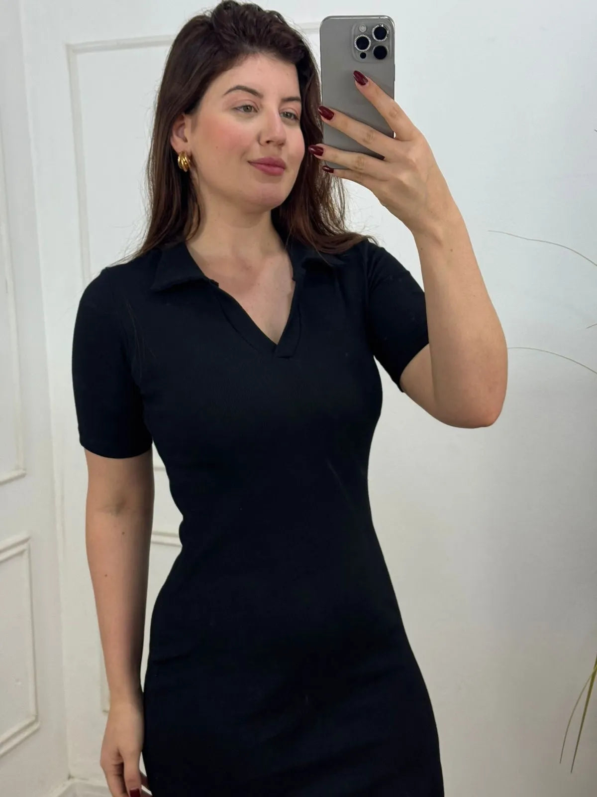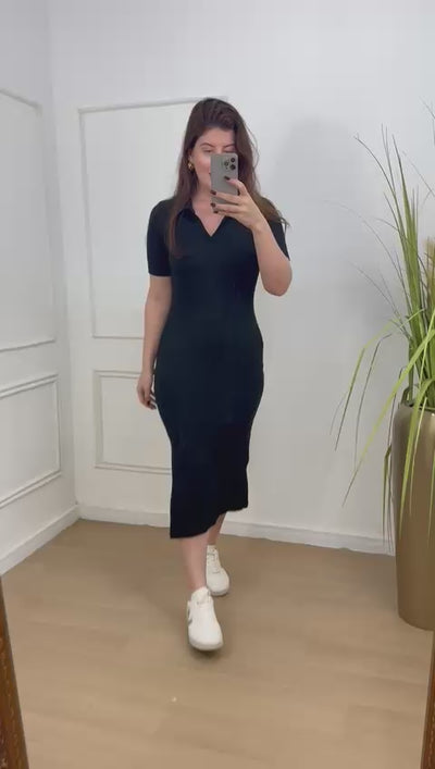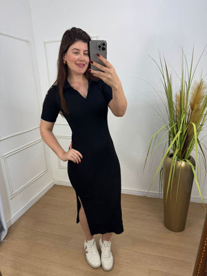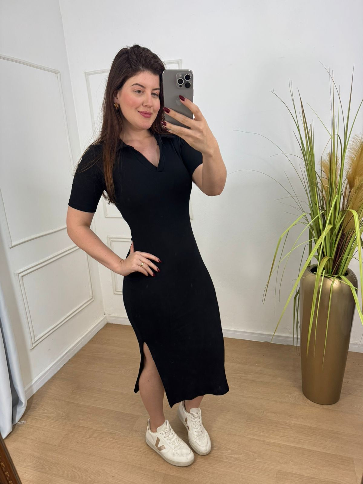 Vestido na malha canelada premium encorpada, gola polo, fenda na lateral.