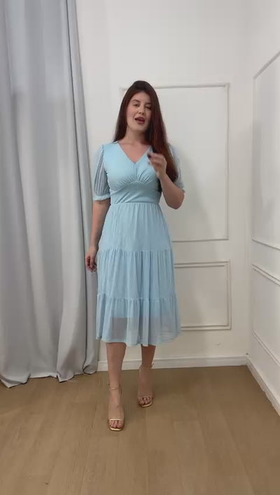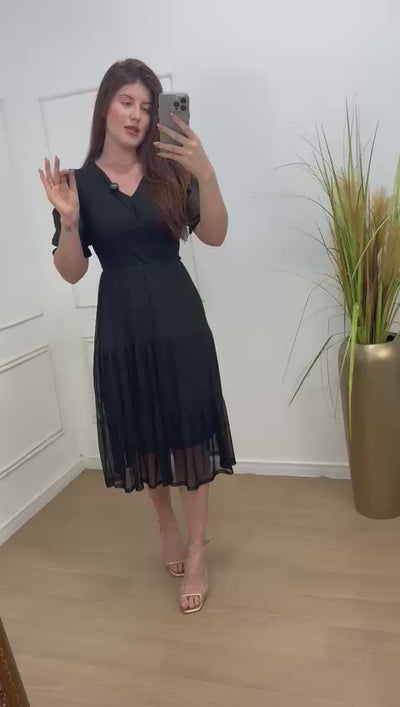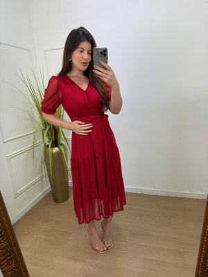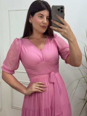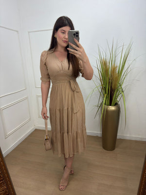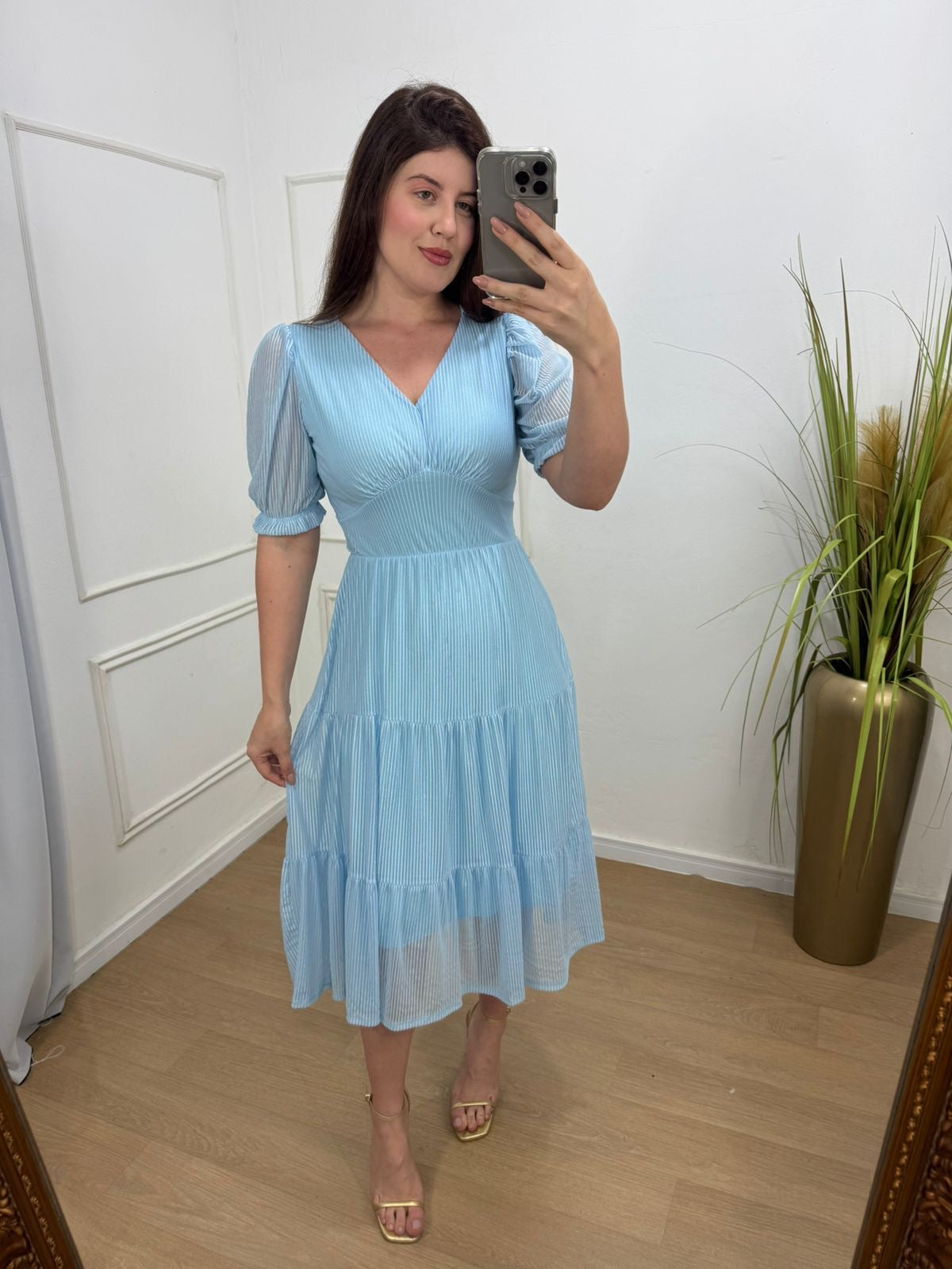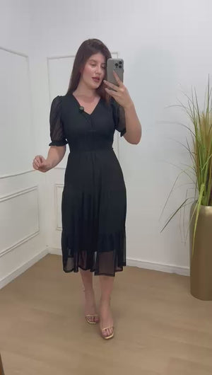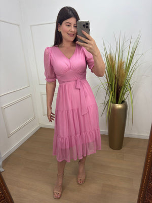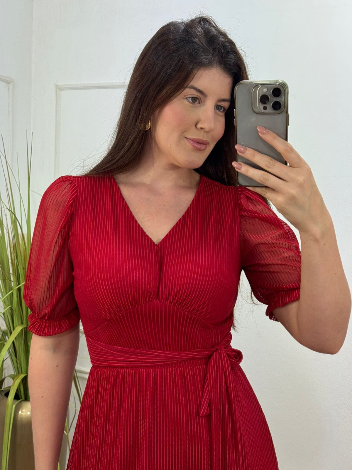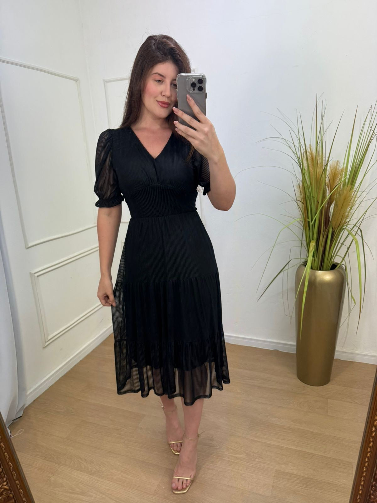 Vestido em tule com elastano todo forrado decote V possui amarração lastex nas costas.