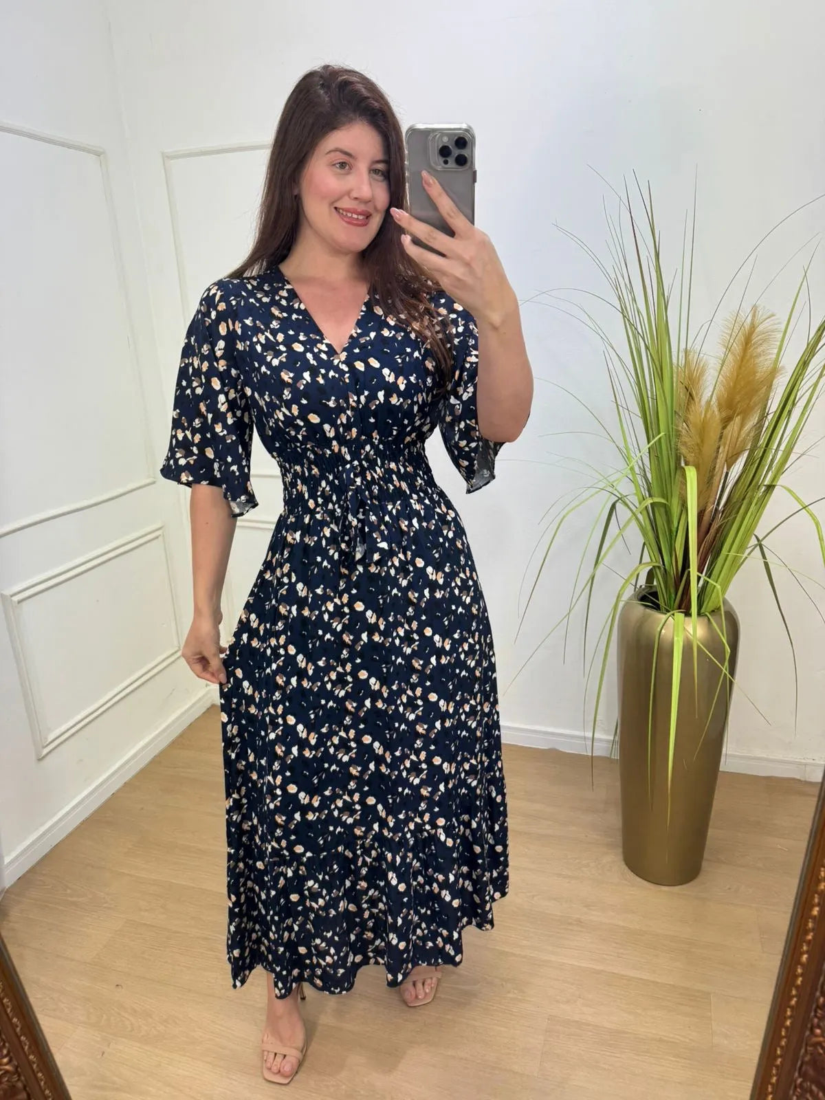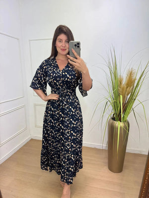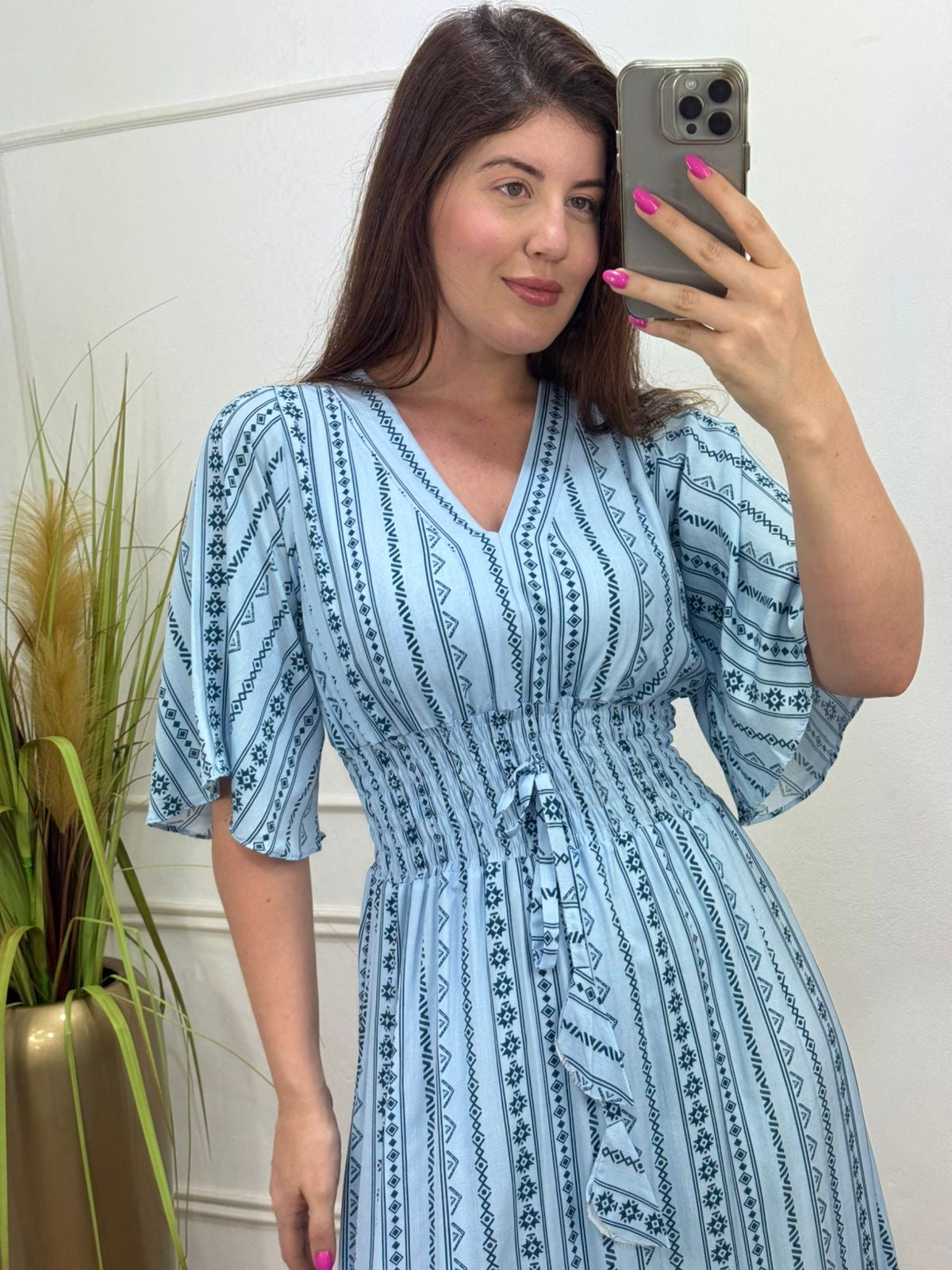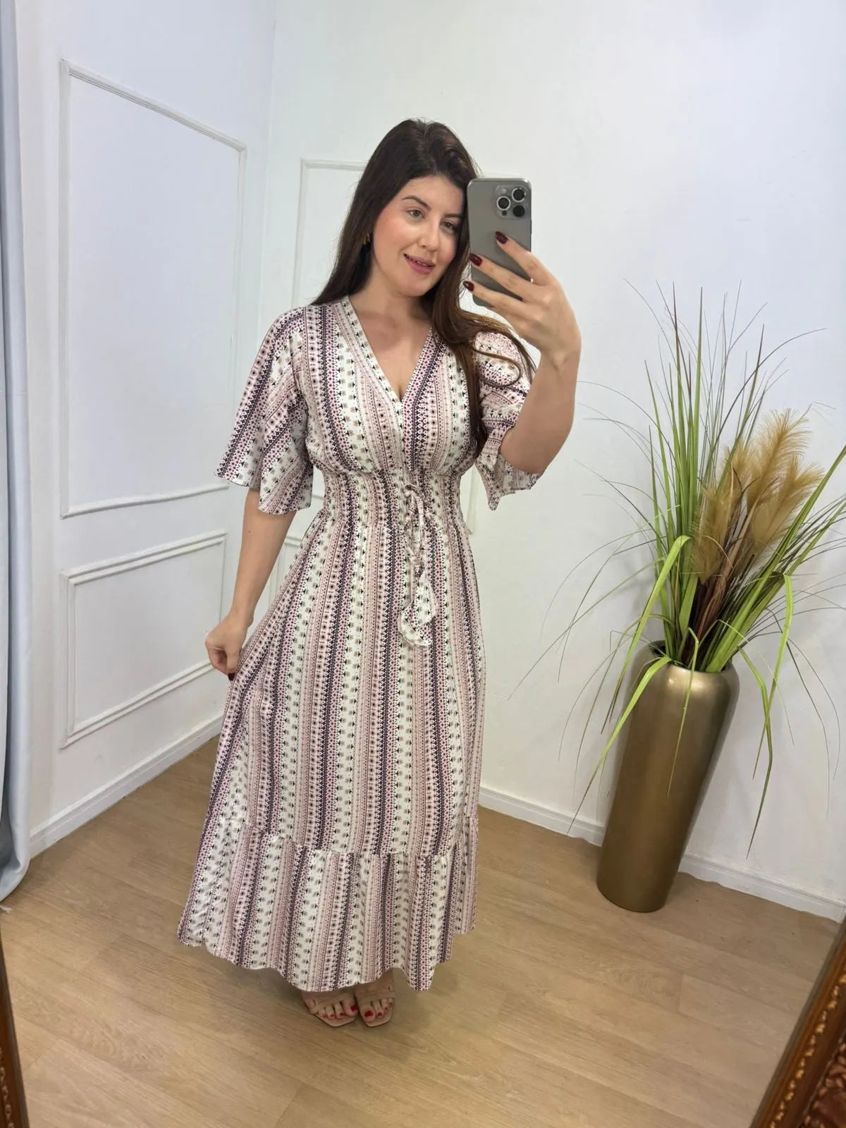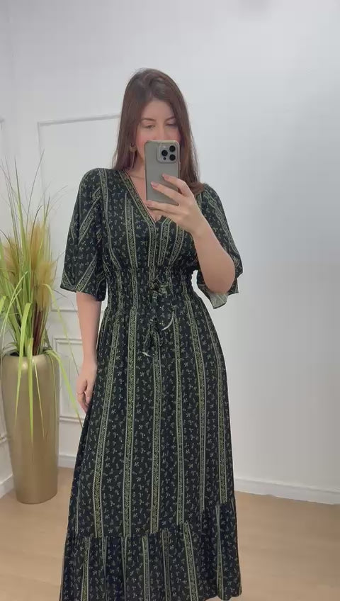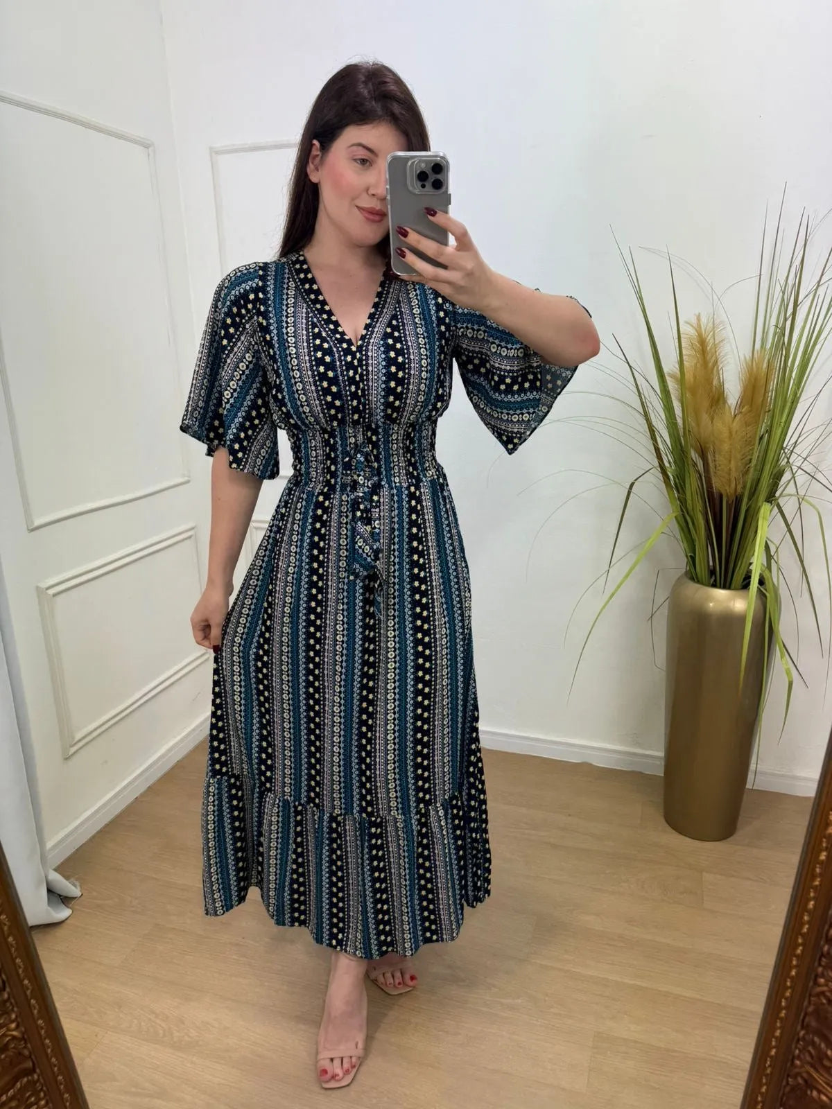 Vestido no viscolinho forrado lastex na cintura manga flare