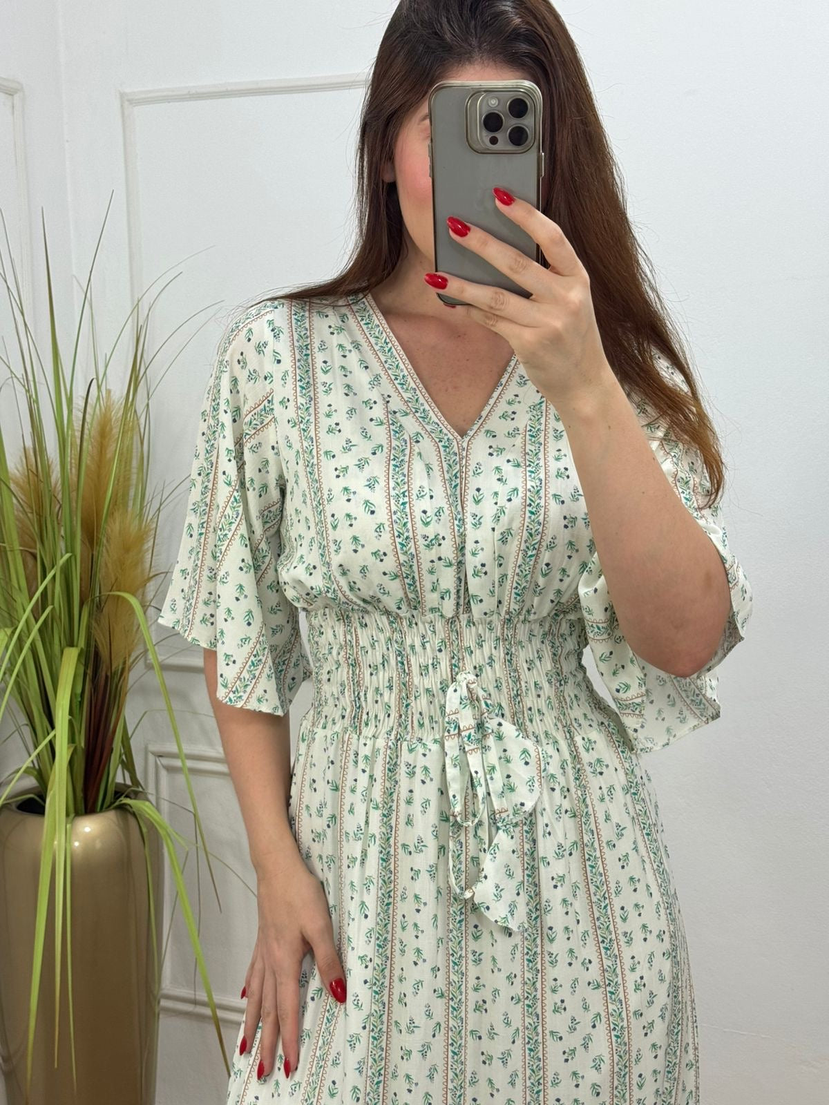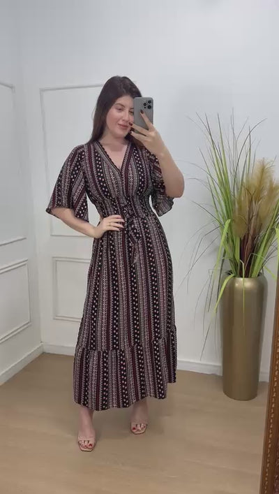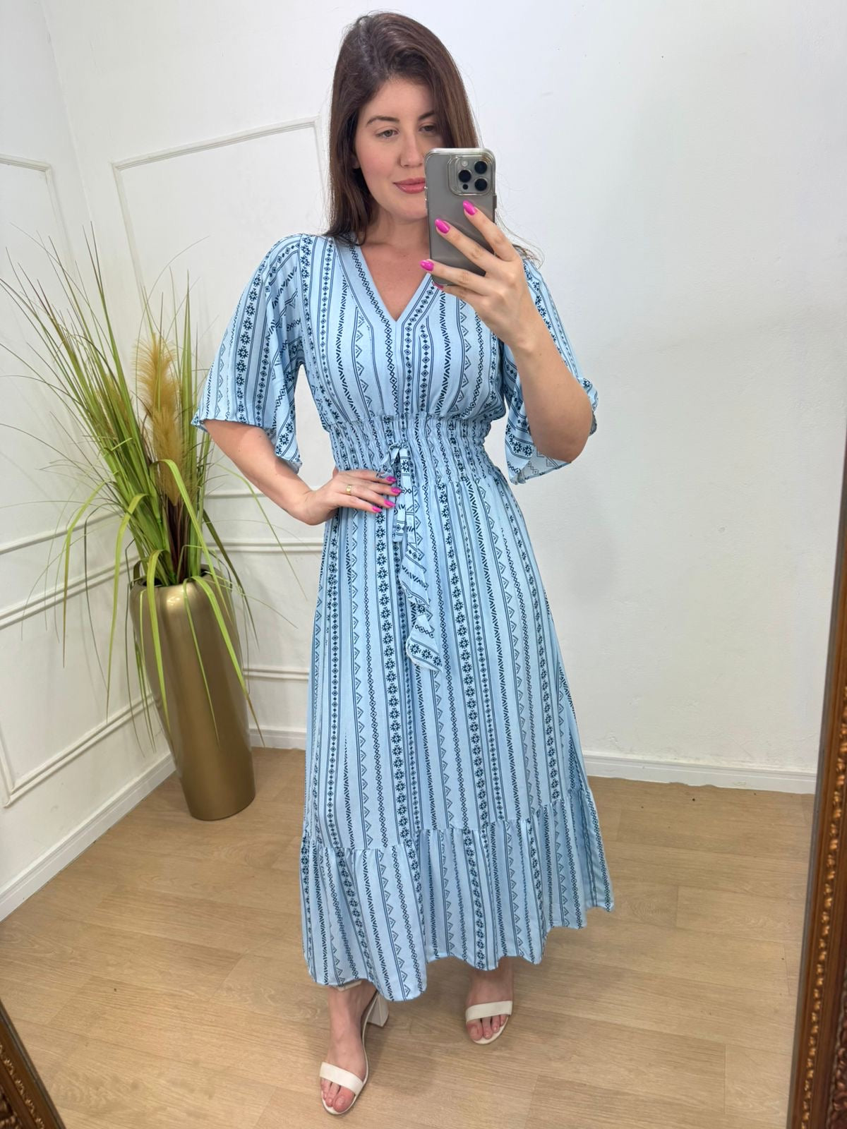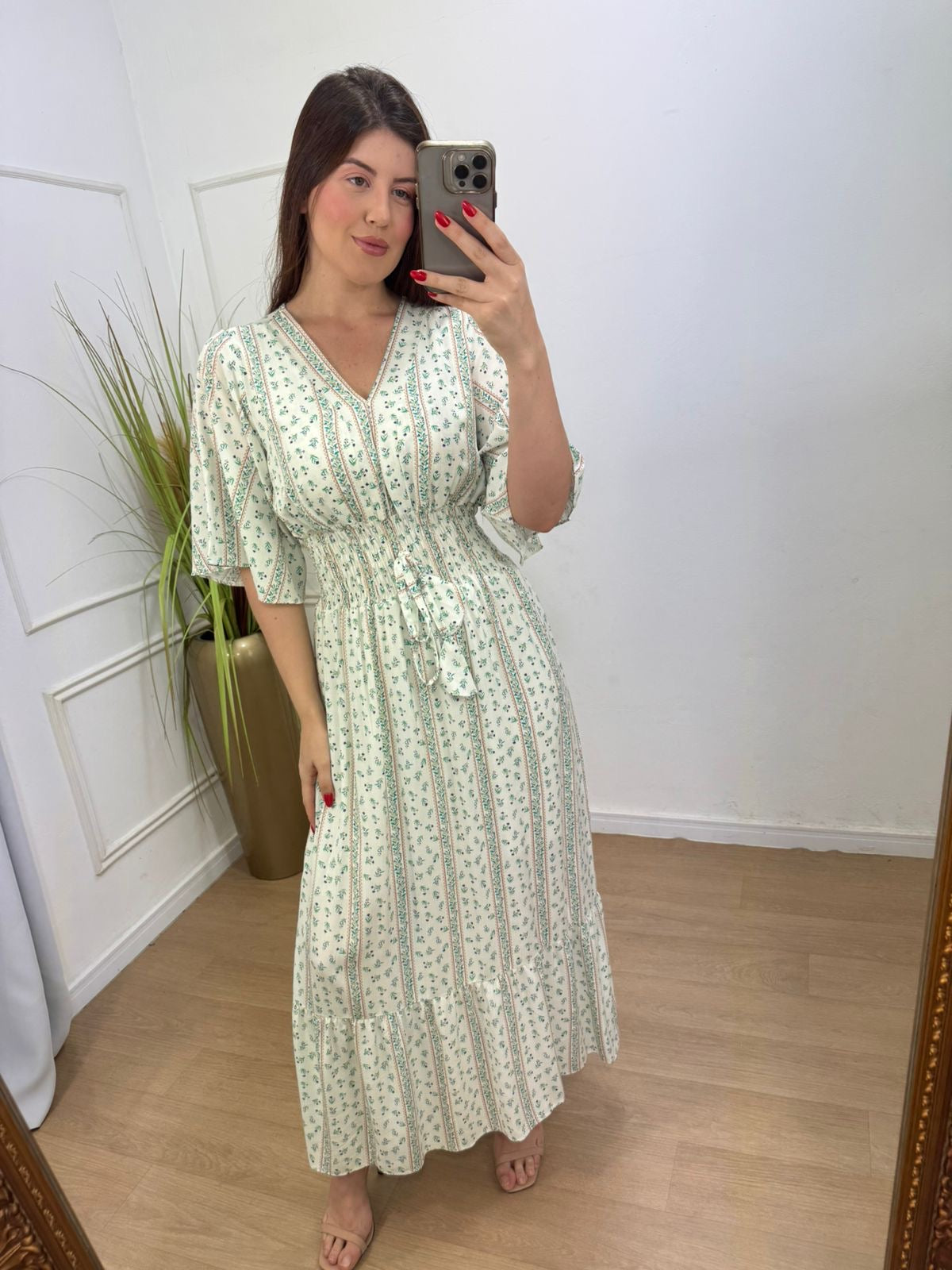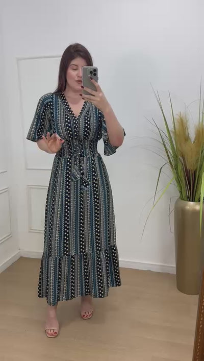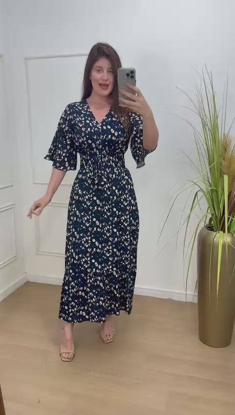 Vestido no viscolinho forrado lastex na cintura manga flare