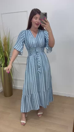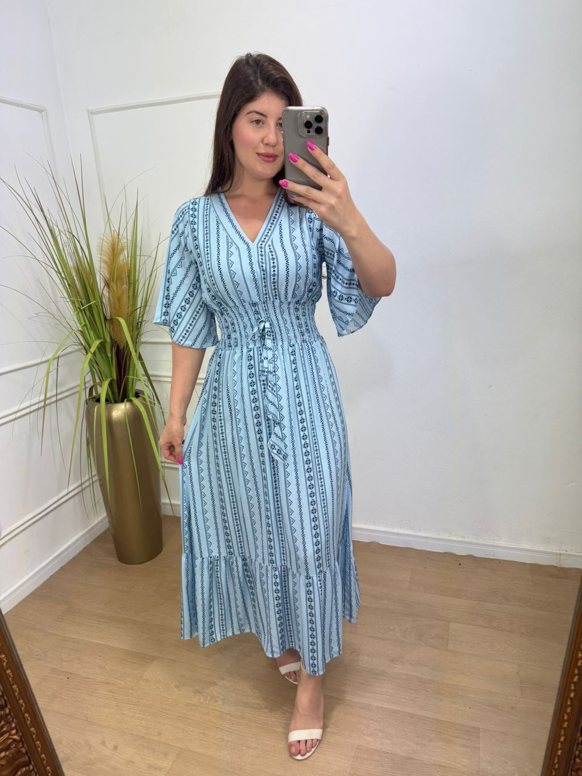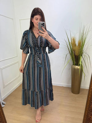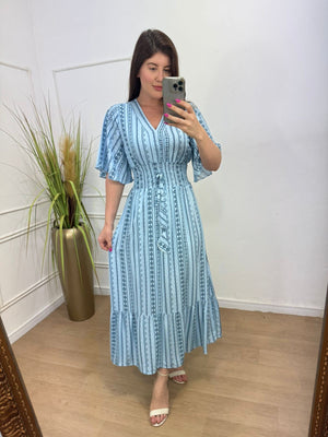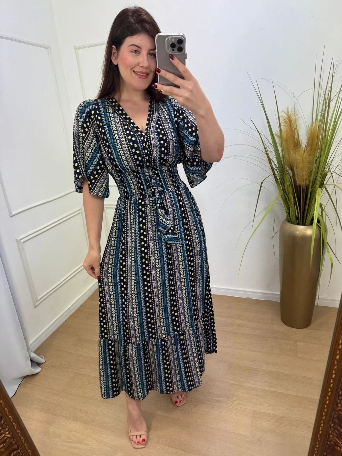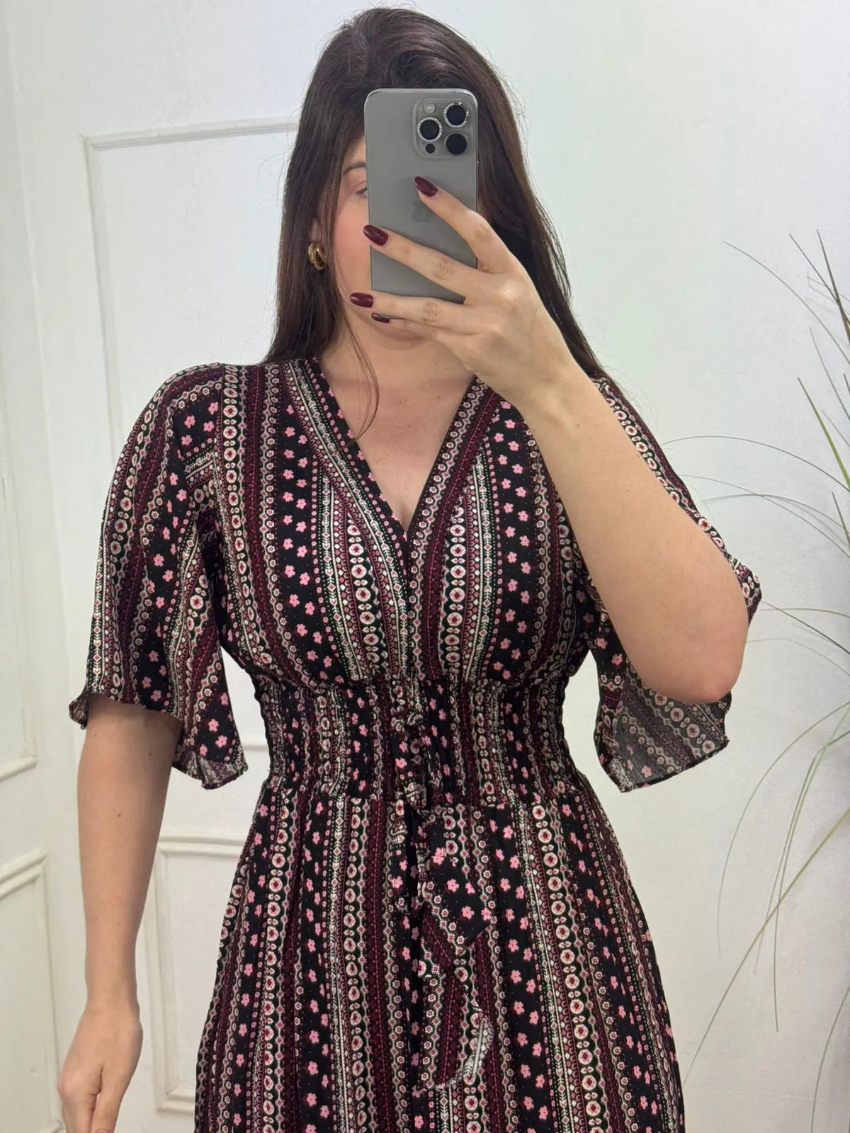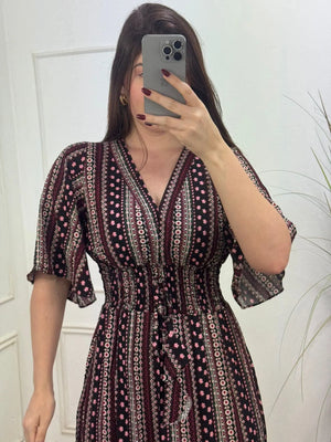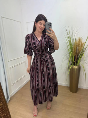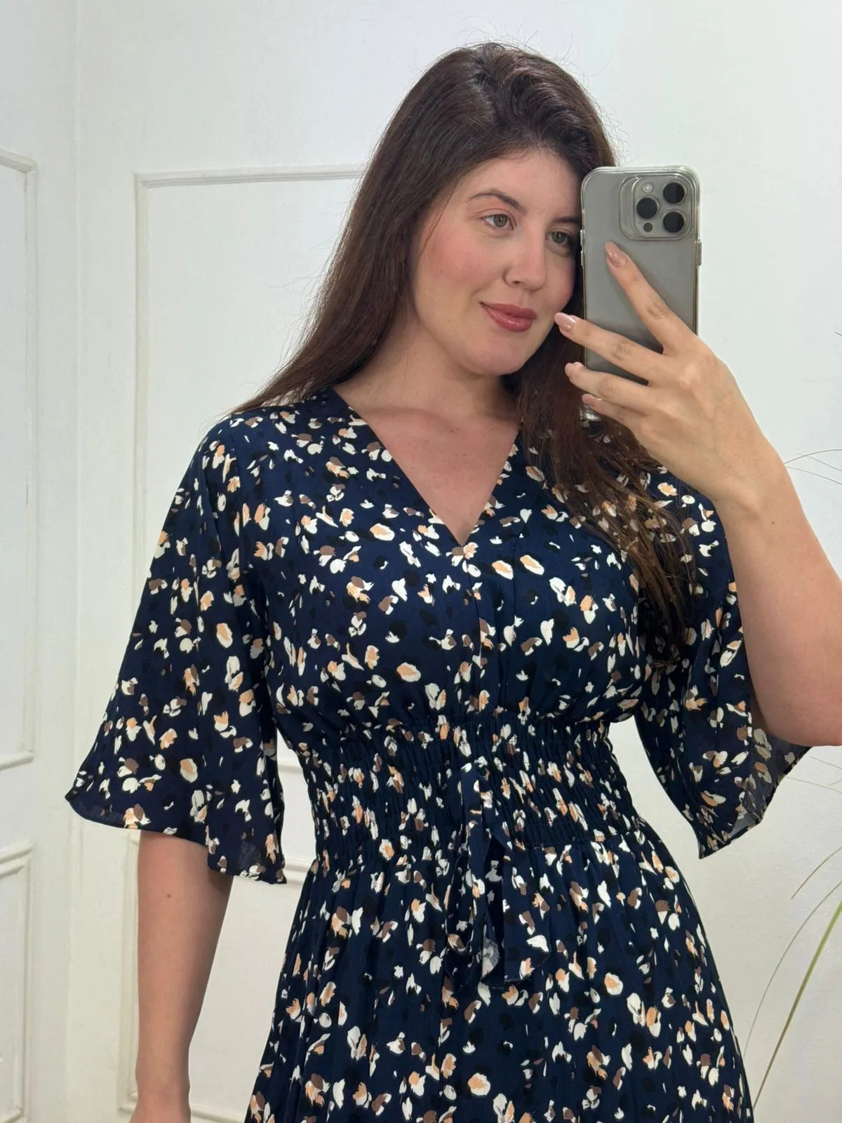 Vestido no viscolinho forrado lastex na cintura manga flare