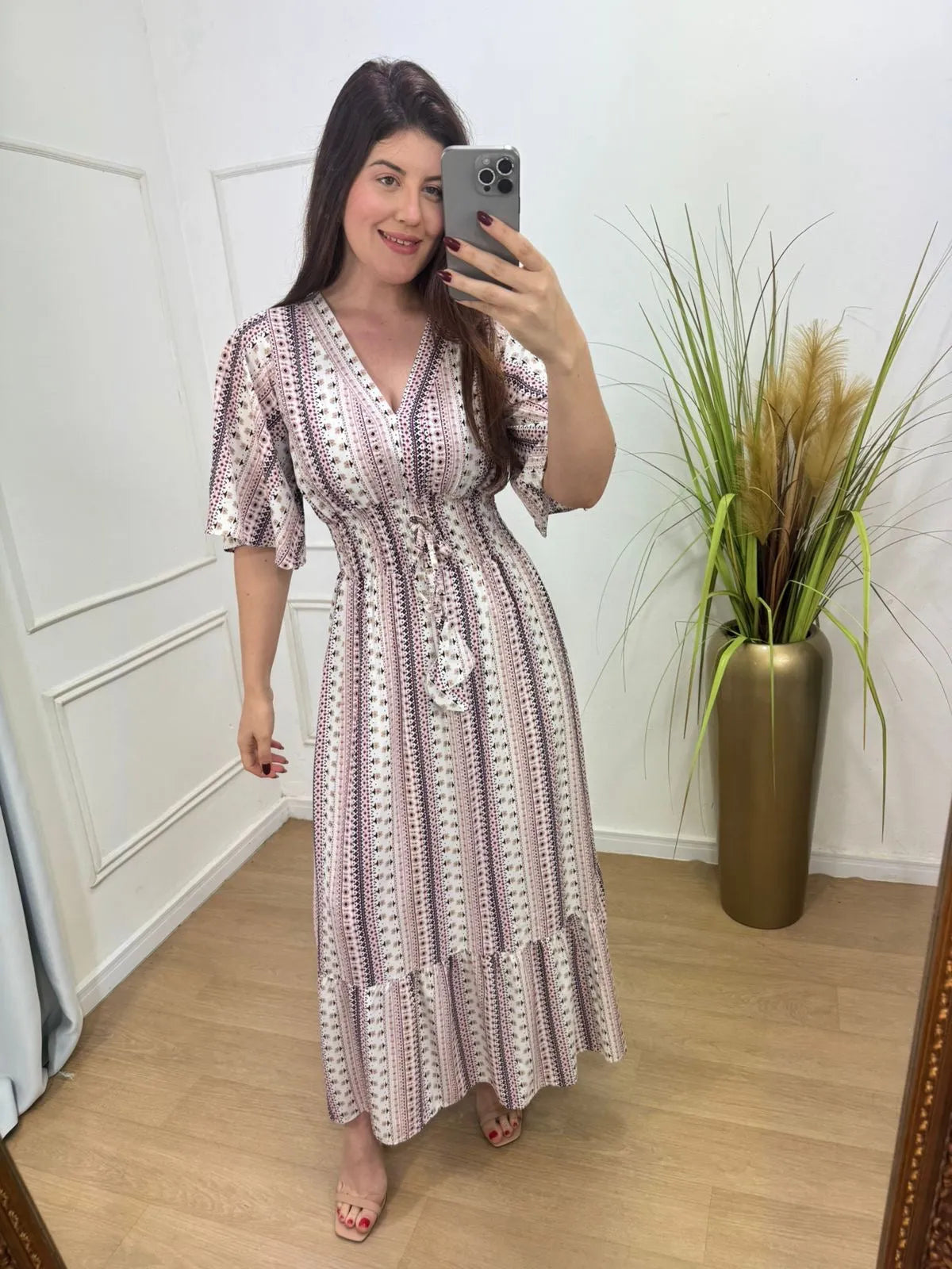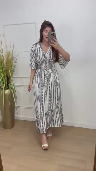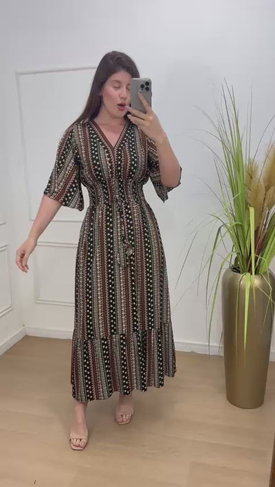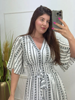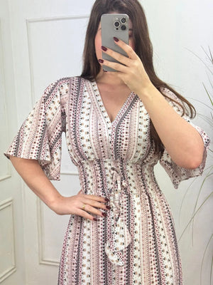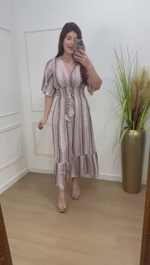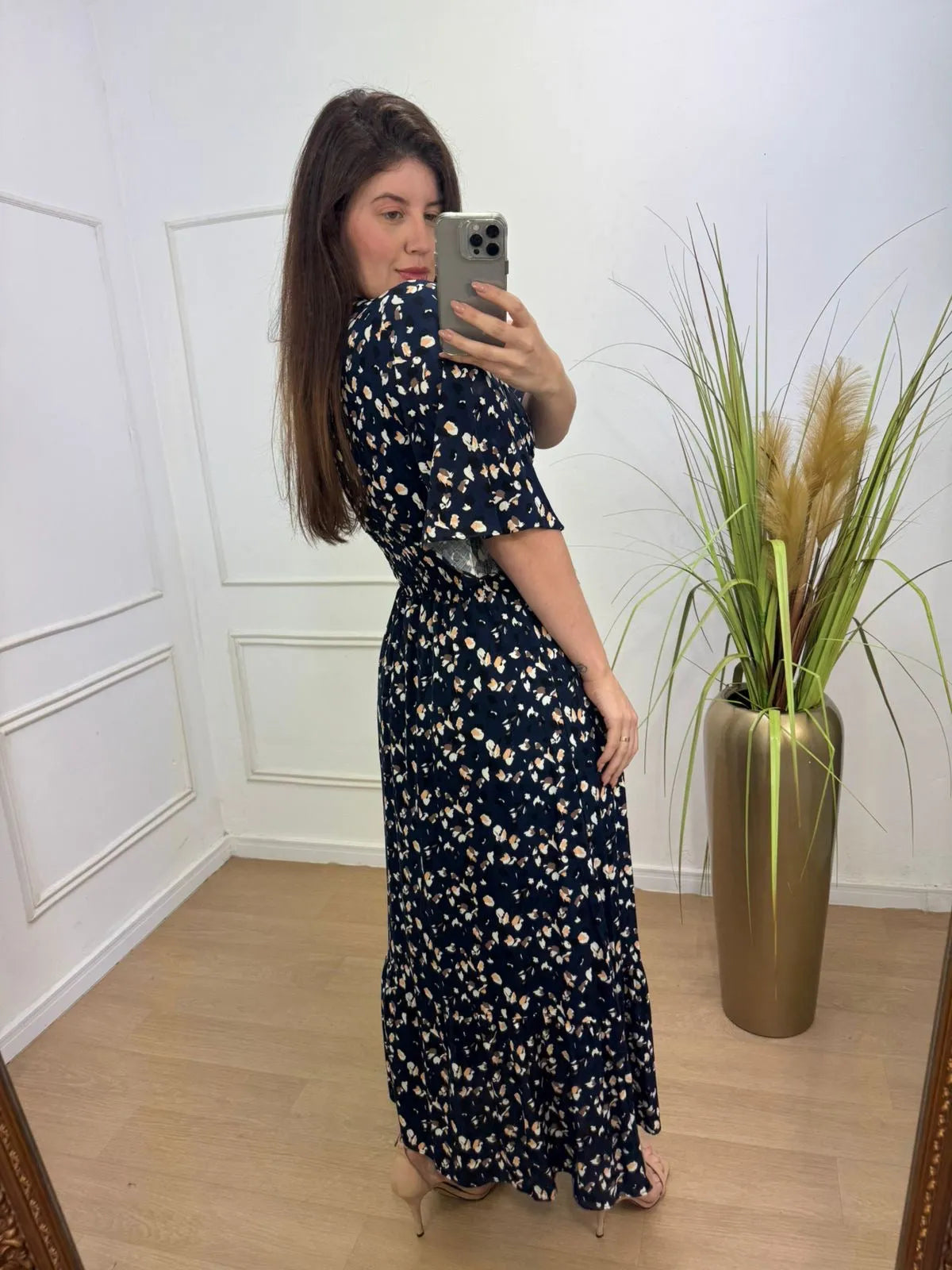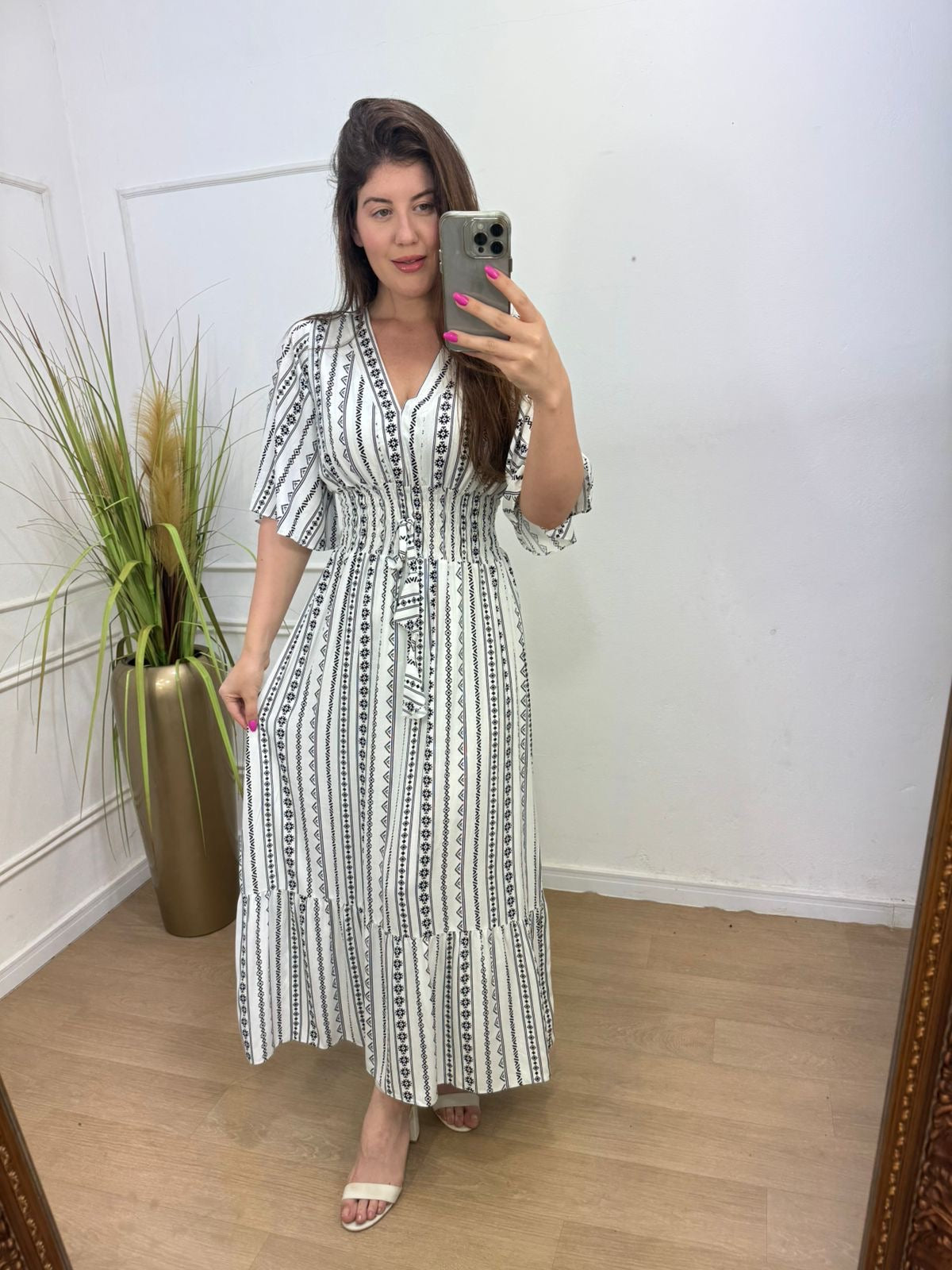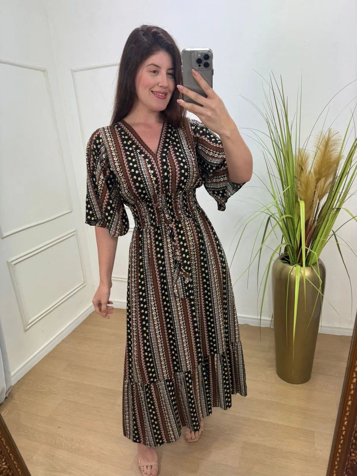 Vestido no viscolinho forrado lastex na cintura manga flare