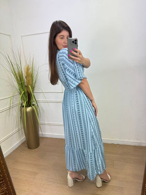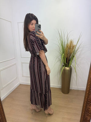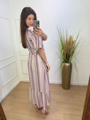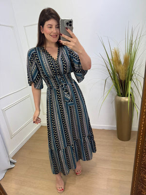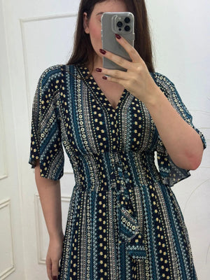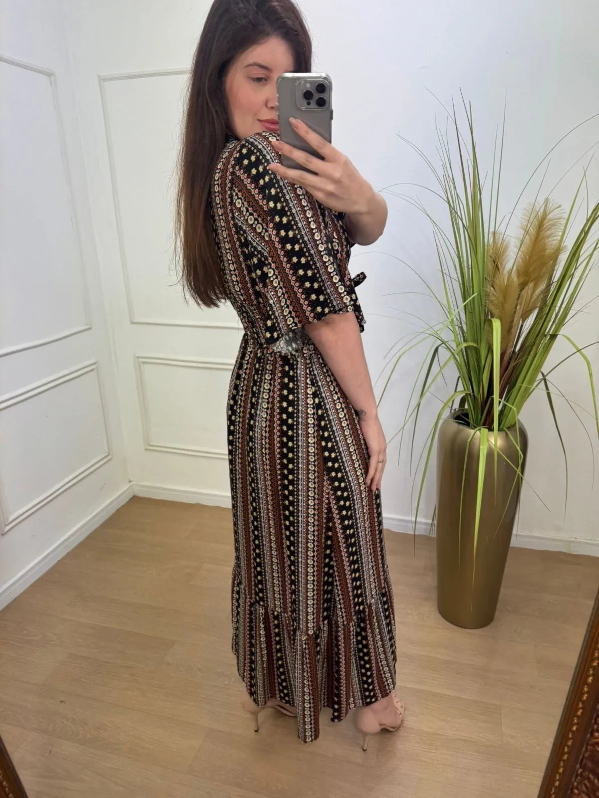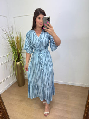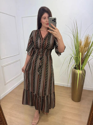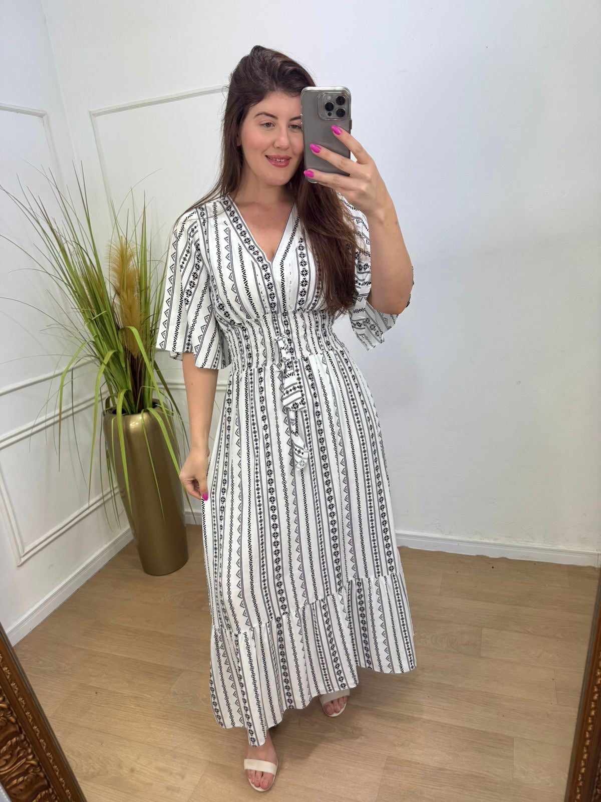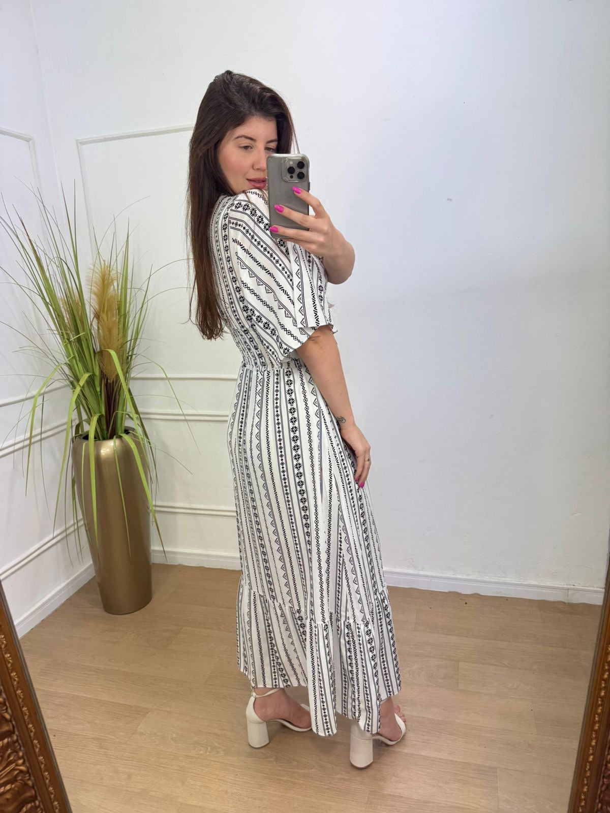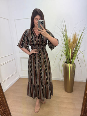 Vestido no viscolinho forrado lastex na cintura manga flare
