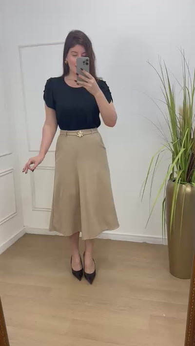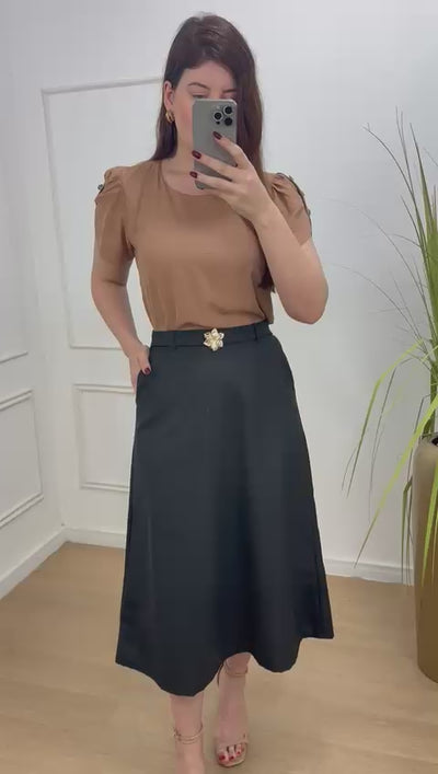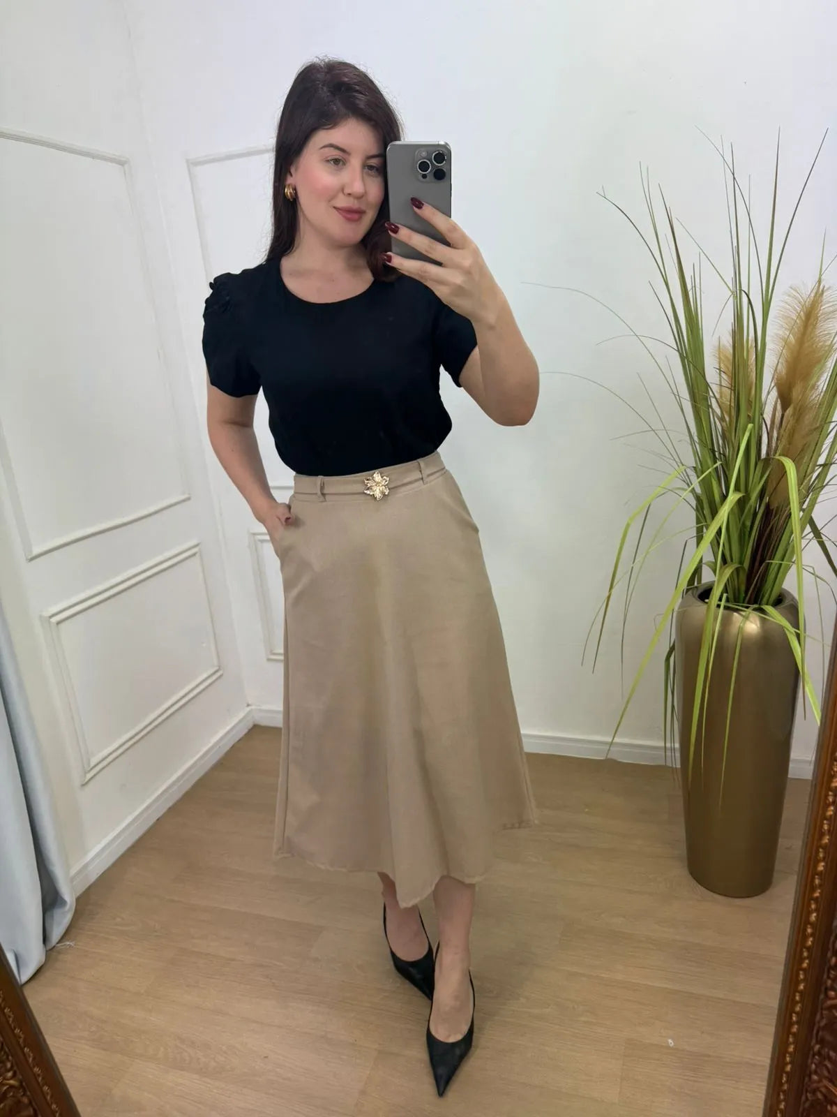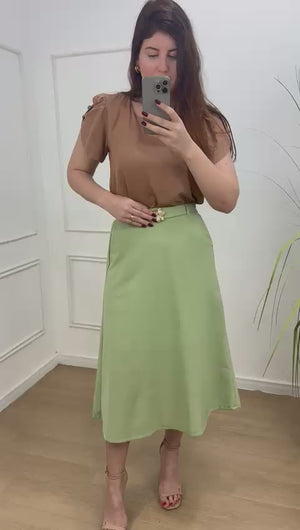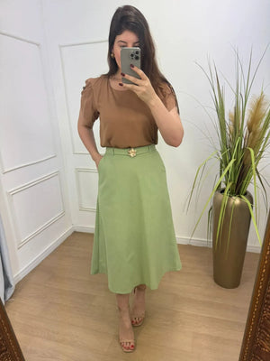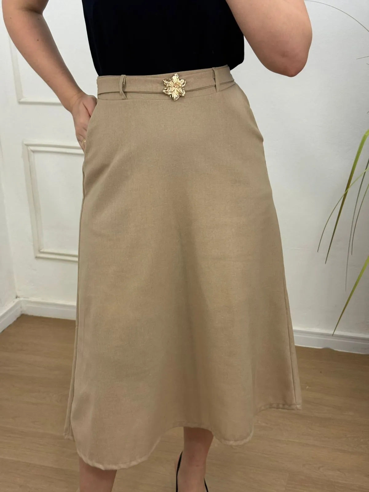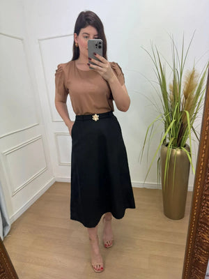 Saia no tecido linho forrada possui bolsos, detalhe em cinto no cos, elástico na parte de trás.