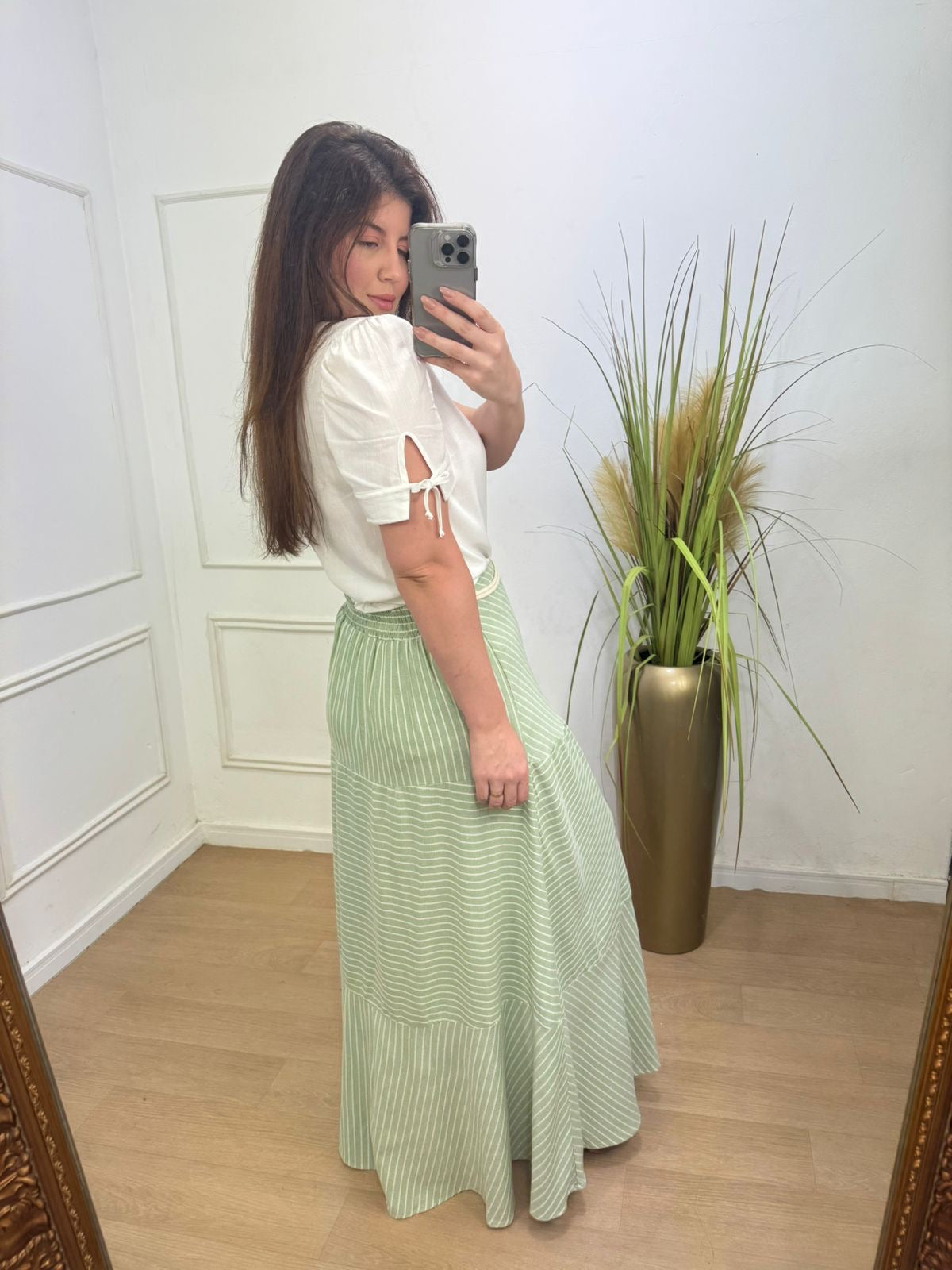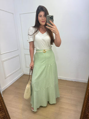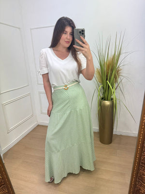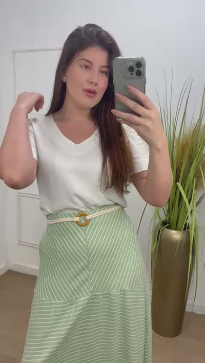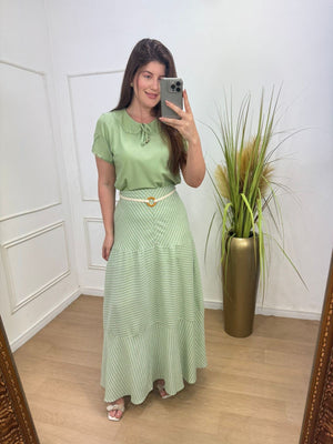 Saia em linho com toque de viscose e algodão fluida, possui flores, elástico no cos ( parte de trás) detalhe em cinto frontal.